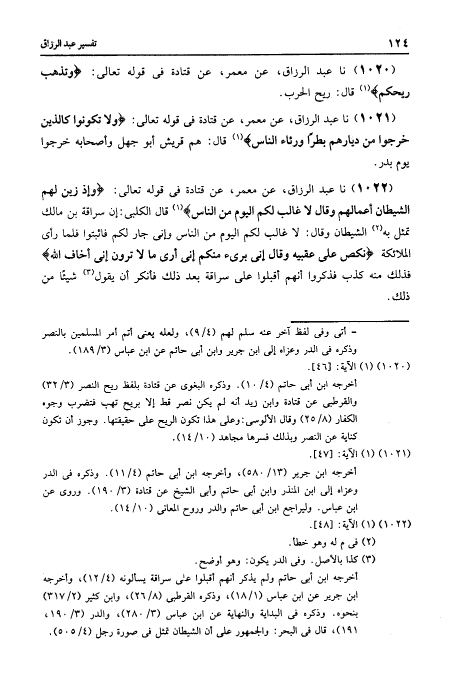 1021 - عَنْ مَعْمَرٍ , عَنْ قَتَادَةَ فِي قَوْلِهِ تَعَالَى: {§وَلَا تَكُونُوا كَالَّذِينَ خَرَجُوا مِنْ دِيَارِهِمْ بَطَرًا وَرِئَاءَ النَّاسِ} [الأنفال: 47] , قَالَ: «هُمْ قُرَيْشٌ , أَبُو جَهْلٍ , وَأَصْحَابُهُ خَرَجُوا يَوْمَ بَدْرٍ»