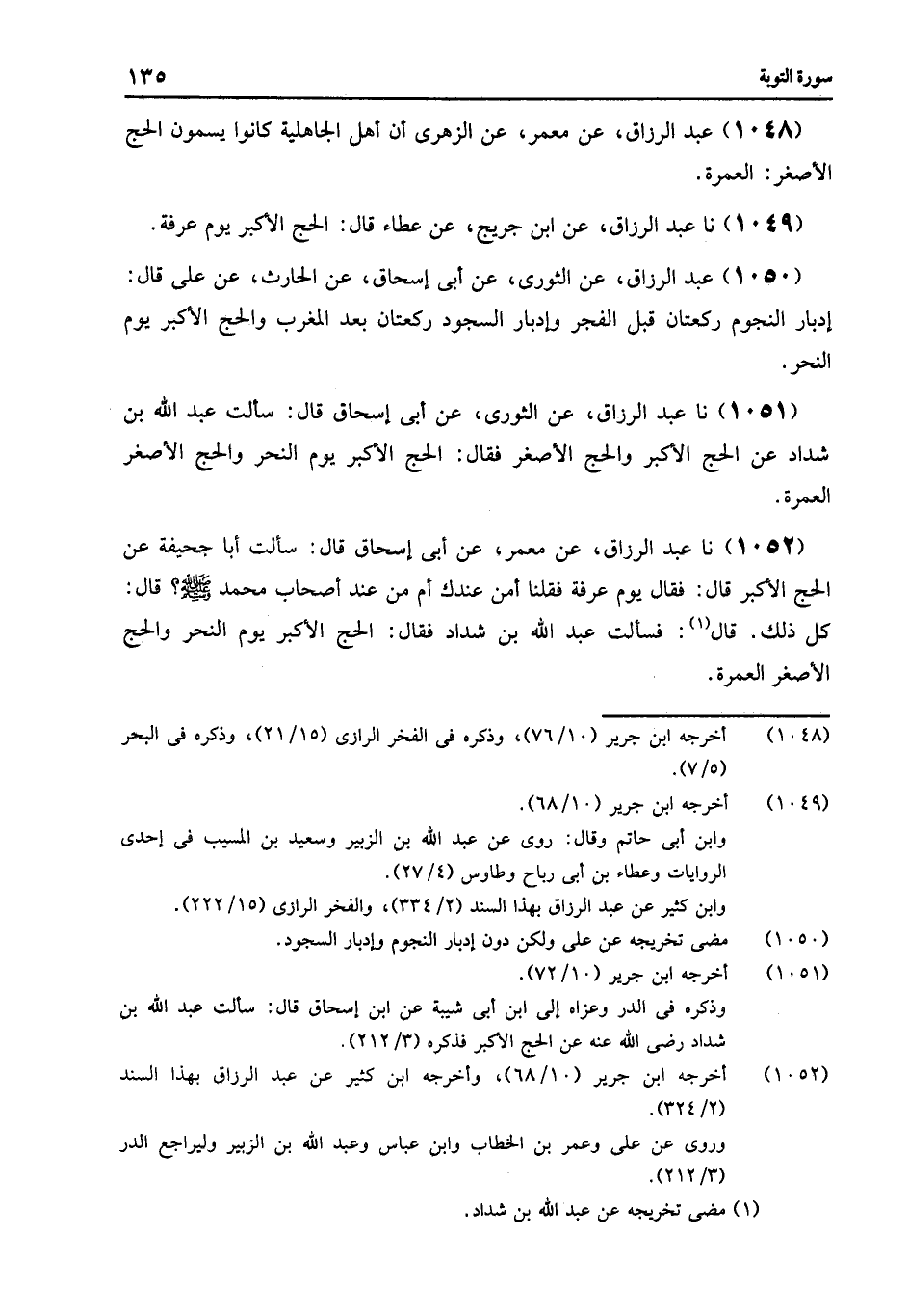 1051 - عَنِ الثَّوْرِيِّ , عَنْ أَبِي إِسْحَاقَ , قَالَ: سَأَلْتُ عَبْدَ اللَّهِ بْنَ شَدَّادٍ عَنِ الْحَجِّ الْأَكْبَرِ , وَالْحَجِّ الْأَصْغَرِ , فَقَالَ: «§الْحَجُّ الْأَكْبَرُ يَوْمُ النَّحْرِ , وَالْحَجُّ الْأَصْغَرُ الْعُمْرَةُ»
