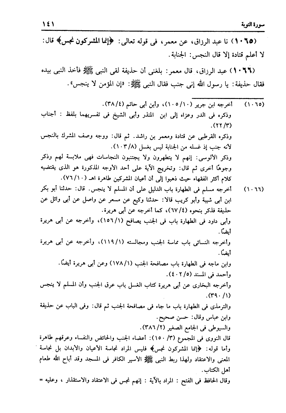 1065 - نا عَبْدُ الرَّزَّاقِ عَنْ مَعْمَرٍ فِي قَوْلِهِ تَعَالَى: {§إِنَّمَا الْمُشْرِكُونَ نَجَسٌ} [التوبة: 28] , قَالَ: «لَا أَعْلَمُ قَتَادَةَ إِلَّا قَالَ النَّجَسُ الْجَنَابَةُ»