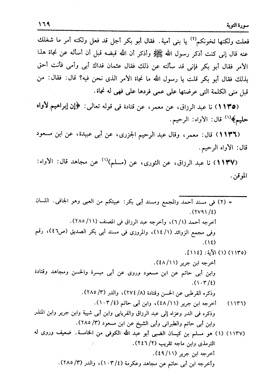 1135 - عَنْ مَعْمَرٍ , عَنْ قَتَادَةَ فِي قَوْلِهِ تَعَالَى: {إِنَّ إِبْرَاهِيمَ لَأَوَّاهٌ حَلِيمٌ} [التوبة: 114] , قَالَ: «§الْأَوَّاهُ الرَّحِيمُ»