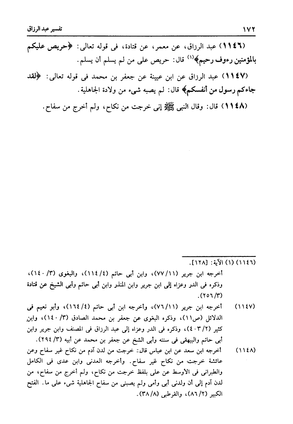 1146 - عَنْ مَعْمَرٍ , عَنْ قَتَادَةَ فِي قَوْلِهِ تَعَالَى: {حَرِيصٌ عَلَيْكُمْ بِالْمُؤْمِنِينَ رَءُوفٌ رَحِيمٌ} , قَالَ: «§حَرِيصٌ عَلَى مَنْ لَمْ يُسْلِمْ أَنْ يُسْلِمَ»