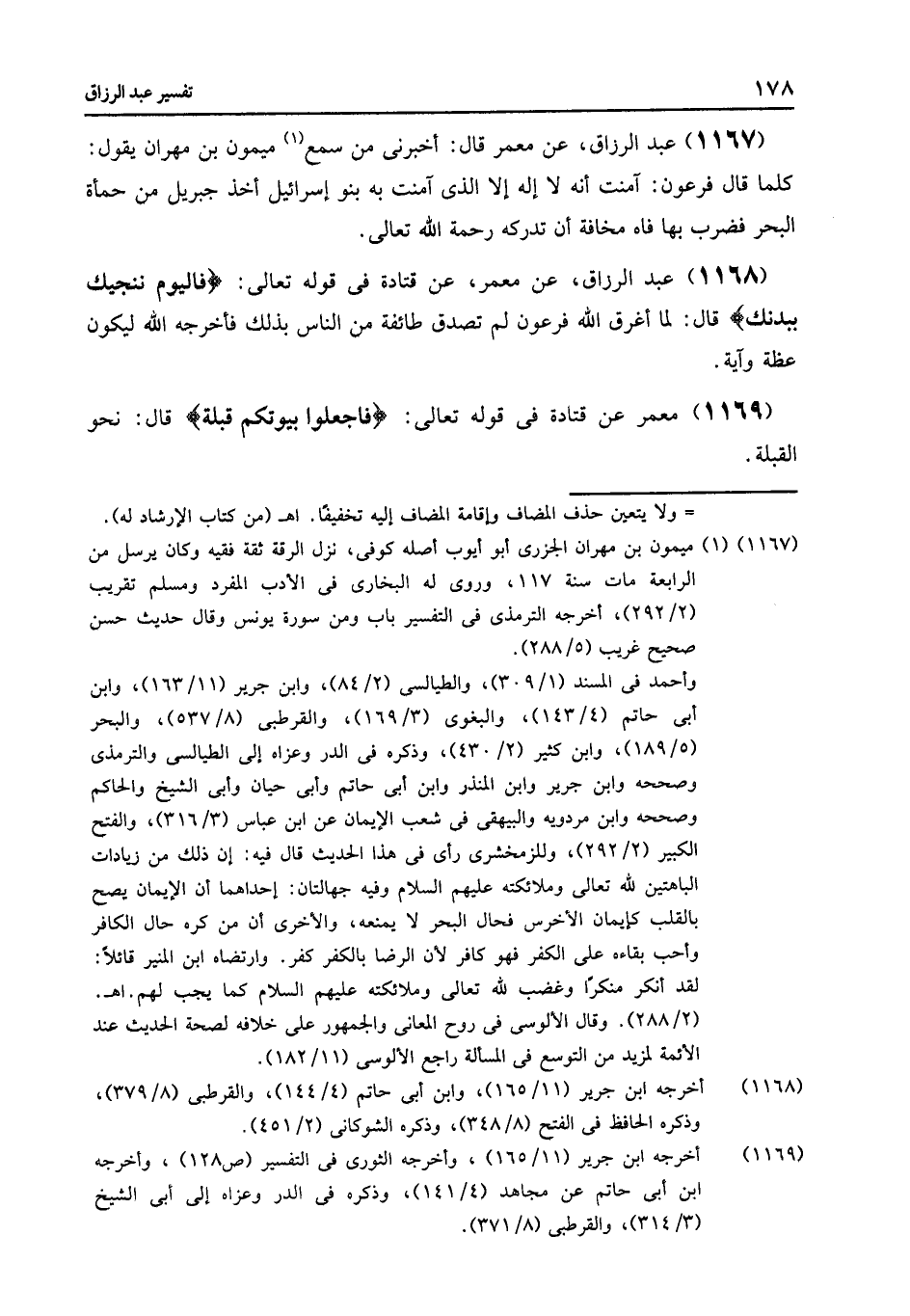 1168 - عَنْ مَعْمَرٍ , عَنْ قَتَادَةَ , فِي قَوْلِهِ تَعَالَى: {فَالْيَوْمَ نُنَجِّيكَ بِبَدَنِكَ} [يونس: 92] , قَالَ: «§لَمَّا أَغْرَقَ اللَّهُ فِرْعَوْنَ لَمْ تُصَدِّقْ طَائِفَةٌ مِنَ النَّاسِ بِذَلِكَ , فَأَخْرَجَهُ اللَّهُ؛ لِيَكُونَ عِظَةً وَآيَةً»