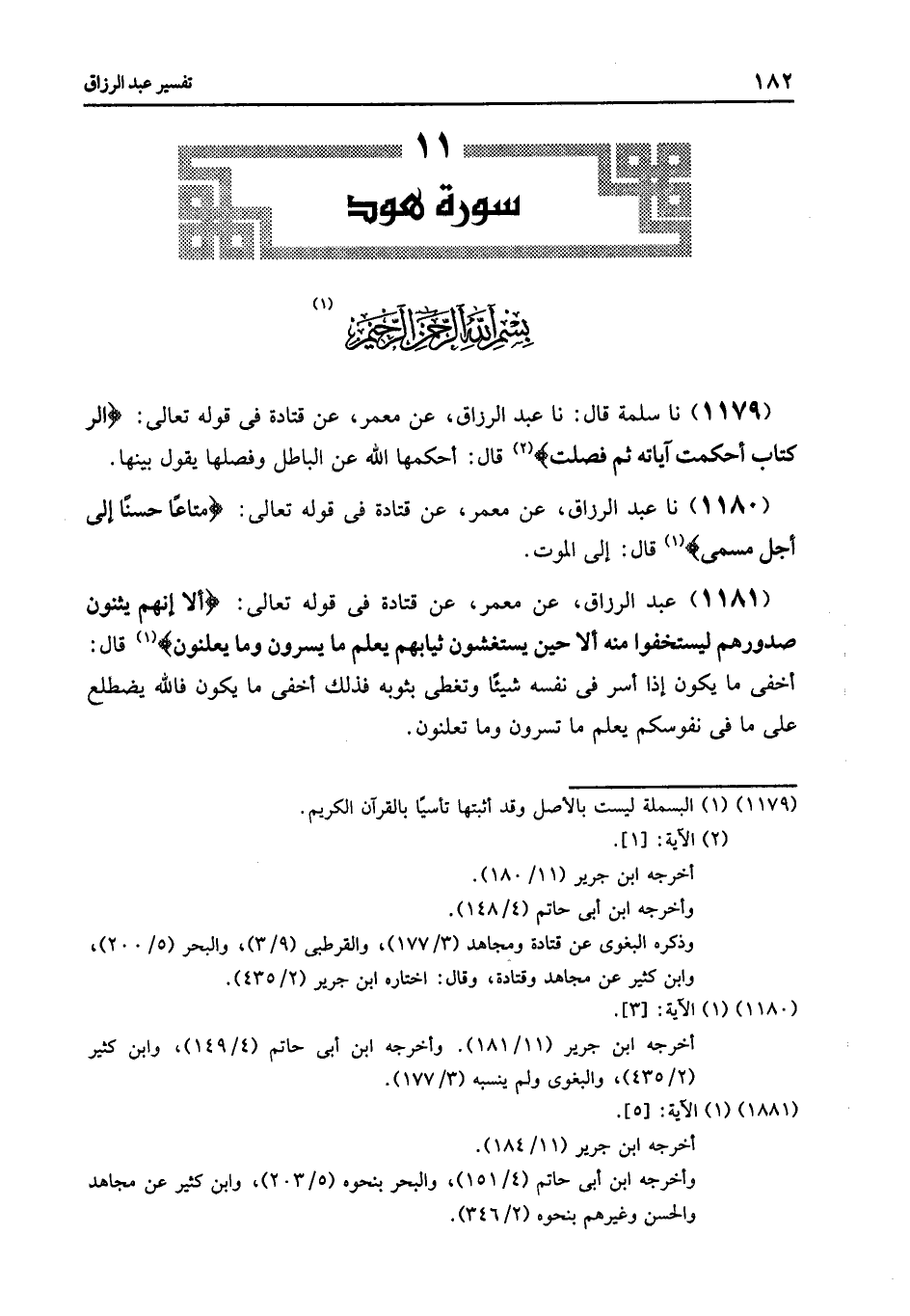 1179 - عَنْ مَعْمَرٍ , عَنْ قَتَادَةَ , فِي قَوْلِهِ تَعَالَى: {الر كِتَابٌ أُحْكِمَتْ آيَاتُهُ ثُمَّ فُصِّلَتْ} [هود: 1] , قَالَ: «§أَحْكَمَهَا اللَّهُ عَنَ الْبَاطِلِ وَفَصَّلَهَا» , يَقُولُ: «بَيَّنَهَا»