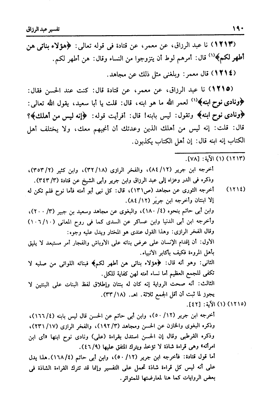 1215 - عَنْ مَعْمَرٍ , عَنْ قَتَادَةَ , قَالَ: §كُنْتُ عِنْدَ الْحَسَنِ , فَقَالَ: {وَنَادَى نُوحٌ ابْنَهُ} [هود: 42] لَعَمْرُ اللَّهِ مَا هُوَ ابْنُهُ " قَالَ: قُلْتُ: يَا أَبَا سَعِيدٍ , يَقُولُ اللَّهُ تَعَالَى: {وَنَادَى نُوحٌ ابْنَهُ} [هود: 42] , وَتَقُولُ: لَيْسَ بِابْنِهِ قَالَ: أَفَرَأَيْتَ قَوْلَهُ: {إِنَّهُ لَيْسَ مِنْ أَهْلِكِ} [هود: 46] ؟ , قَالَ: قُلْتُ: إِنَّهُ لَيْسَ مِنْ أَهْلِكِ الَّذِينَ وَعَدْتُكَ أَنْ أُنَجِّيَهُمْ مَعَكَ , وَلَا يَخْتَلِفُ أَهْلُ الْكِتَابِ أَنَّهُ ابْنُهُ , قَالَ: «إِنَّ أَهْلَ الْكِتَابِ يَكْذِبُونَ»