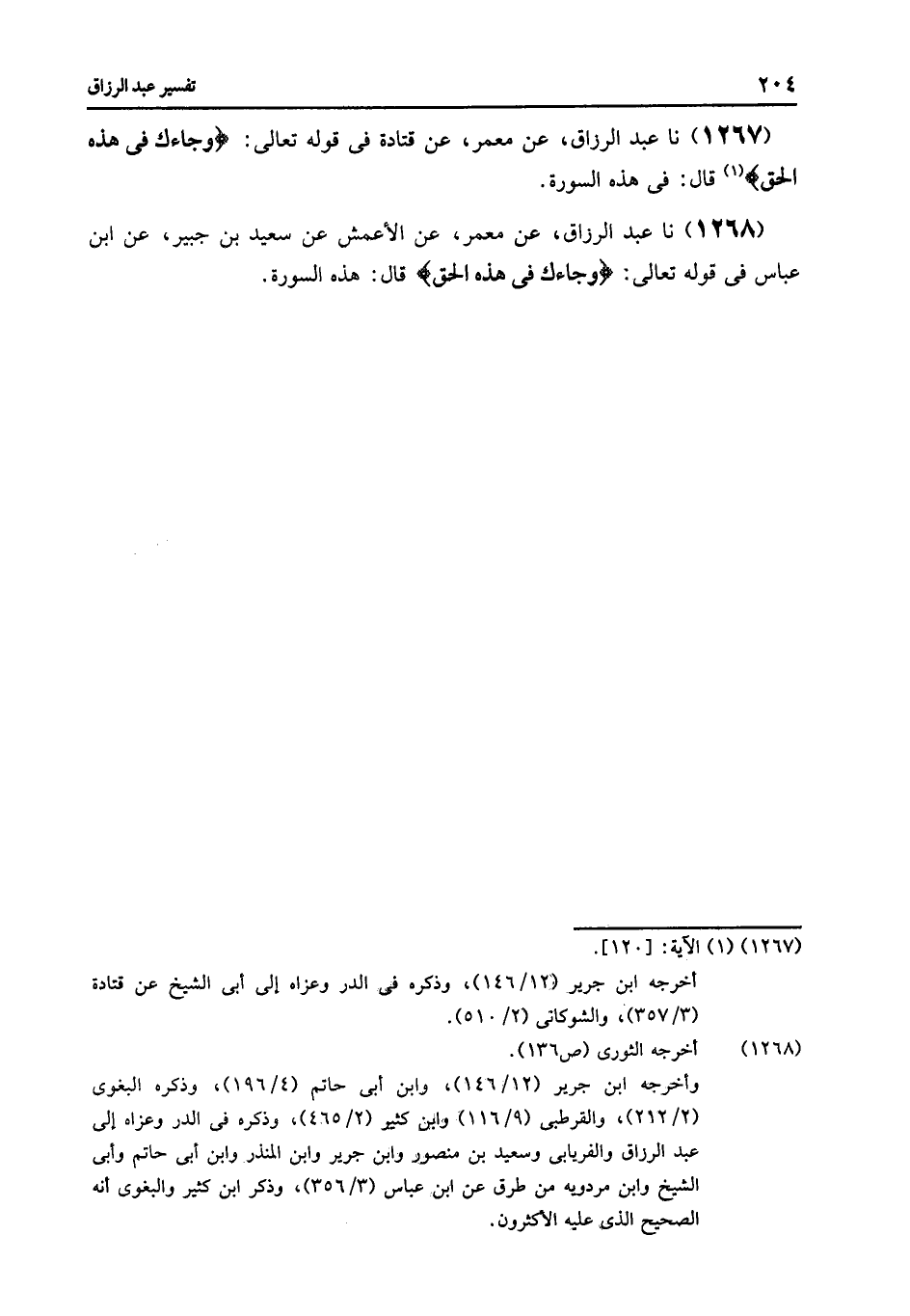1267 - عَنْ مَعْمَرٍ , عَنْ قَتَادَةَ , فِي قَوْلِهِ تَعَالَى: {§وَجَاءَكَ فِي هَذِهِ الْحَقُّ} [هود: 120] , قَالَ: «فِي هَذِهِ السُّورَةِ»