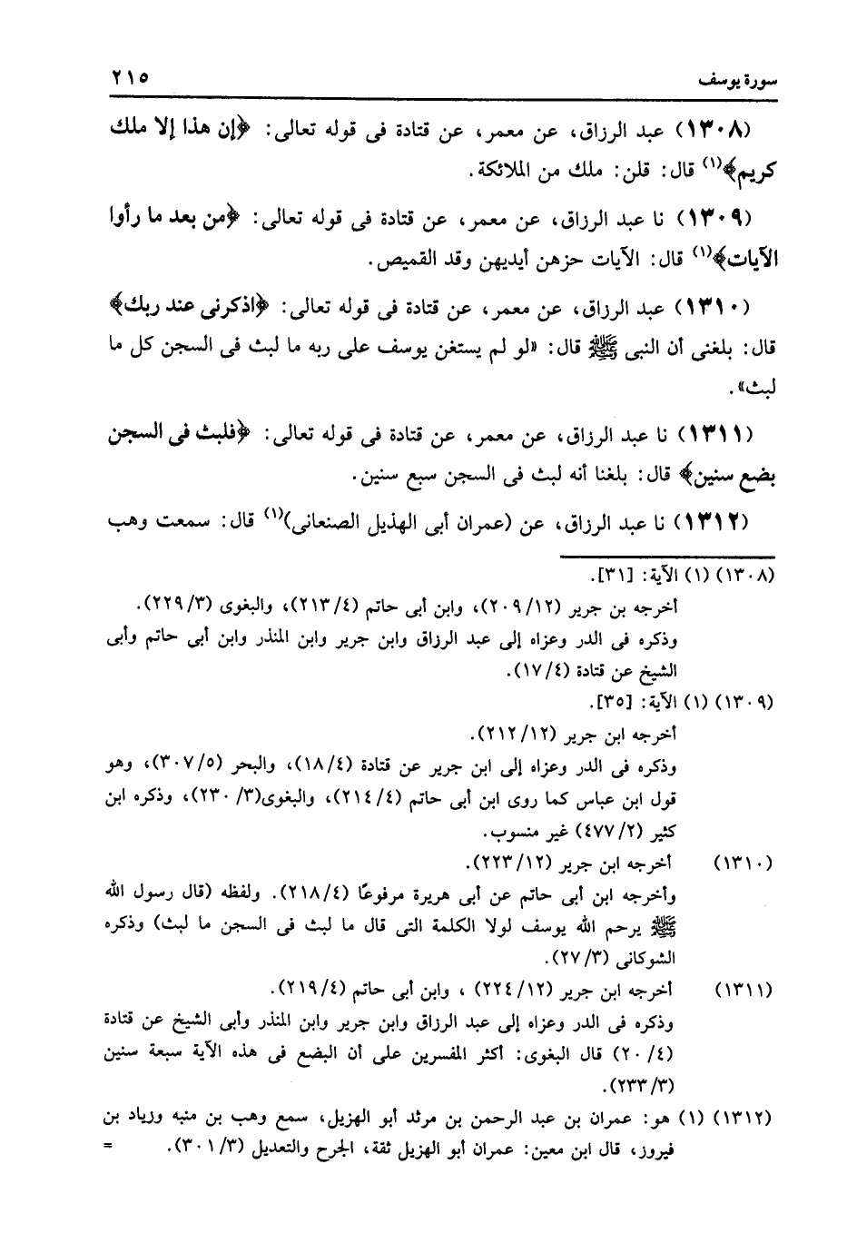 1310 - عَنْ مَعْمَرٍ , عَنْ قَتَادَةَ , فِي قَوْلِهِ تَعَالَى: {اذْكُرْنِي عِنْدَ رَبِّكَ} [يوسف: 42] , قَالَ: بَلَغَنِي أَنَّ النَّبِيَّ صَلَّى اللهُ عَلَيْهِ وَسَلَّمَ , قَالَ: «§لَوْ لَمْ يَسْتَعِنِ يُوسُفُ عَلَى رَبِّهِ مَا لَبِثَ فِي السِّجْنِ كُلَّ مَا لَبِثَ»