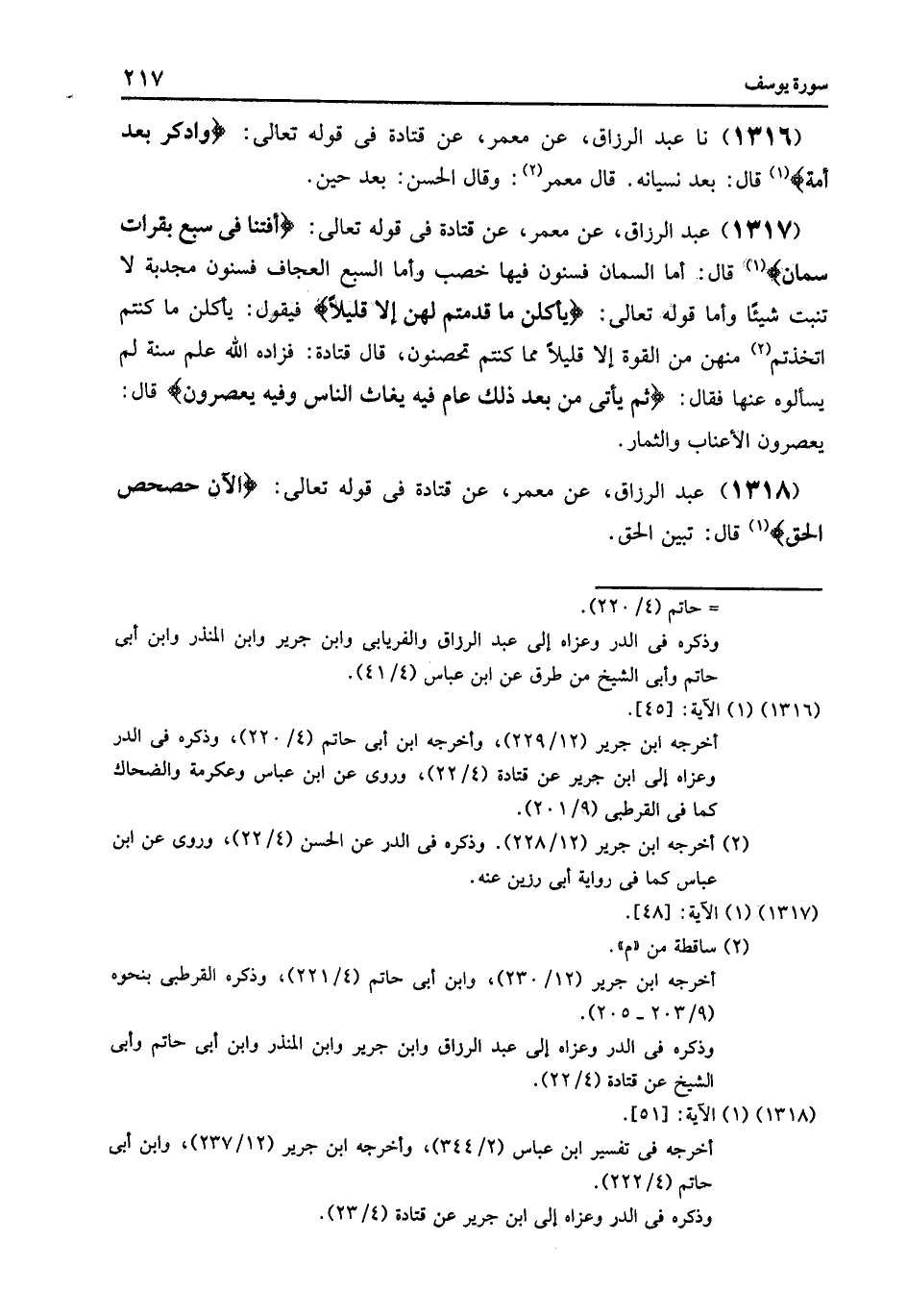 1317 - عَنْ مَعْمَرٍ , عَنْ قَتَادَةَ , فِي قَوْلِهِ تَعَالَى: {أَفْتِنَا فِي سَبْعِ بَقَرَاتٍ سِمَانٍ} [يوسف: 46] , قَالَ: «§أَمَّا السِّمَانُ فَسِنُونَ فِيهَا خِصْبٌ , وَأَمَّا السَّبْعُ الْعِجَافِ فَسِنُونَ مُجْدِبَةٌ لَا تُنْبِتُ شَيْئًا» وَأَمَّا قَوْلُهُ تَعَالَى: {يَأْكُلْنَ مَا قَدَّمْتُمْ لَهُنَّ إِلَّا قَلِيلًا} [يوسف: 48] , فَيَقُولُ: «يَأْكُلْنَ مَا كُنْتُمُ اتَّخَذْتُمْ فِيهِنَّ مِنَ الْقُوَّةِ إِلَّا قَلِيلًا مِمَّا كُنْتُمْ تُحْصِنُونَ» , قَالَ قَتَادَةُ: «فَزَادَهُ اللَّهُ عِلْمَ سَنَةٍ لَمْ يَسْأَلُوهُ عَنْهَا» , فَقَالَ: {ثُمَّ يَأْتِي مِنْ بَعْدِ ذَلِكَ عَامٌ فِيهِ يُغَاثُ النَّاسُ وَفِيهِ يَعْصِرُونَ} [يوسف: 49] , قَالَ: «يَعْصِرُونَ الْأَعْنَابَ وَالثِّمَارَ»