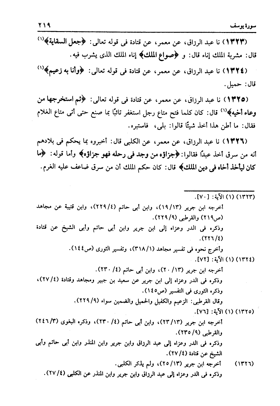 1327 - عَنْ مَعْمَرٍ , عَنْ قَتَادَةَ , فِي قَوْلِهِ تَعَالَى: {مَا كَانَ لِيَأْخُذَ أَخَاهُ فِي دِينِ الْمَلِكِ} [يوسف: 76] , قَالَ: «§لَمْ يَكُنْ ذَلِكَ فِي دِينِ الْمَلِكِ أَنَّ مَنْ سَرَقَ أُخِذَ عَبْدًا» {قَالُوا جَزَاؤُهُ مَنْ وُجِدَ فِي رَحْلِهِ فَهُوَ جَزَاؤُهُ} [يوسف: 75] , قَالَ: «كَانُوا أَخْبَرُوهُ بِمَا يُحْكَمُ فِي بِلَادِهِمْ أَنَّهُ مَنْ سَرَقَ ضُعِّفَ عَلَيْهِ الْغُرْمُ وَلَمْ يُؤْخَذْ عَبْدًا»