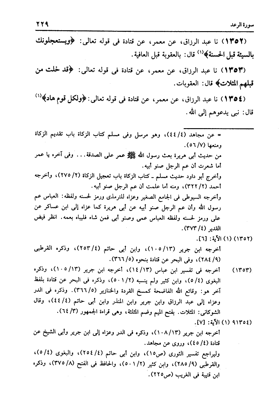 1353 - عَنْ مَعْمَرٍ , عَنْ قَتَادَةَ , فِي قَوْلِهِ تَعَالَى: {وَقَدْ خَلَتْ مِنْ قَبْلِهِمُ الْمَثُلَاتُ} [الرعد: 6] , قَالَ: «§الْعُقُوبَاتُ»