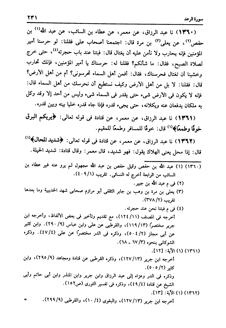 1361 - عَنْ مَعْمَرٍ , عَنْ قَتَادَةَ , فِي قَوْلِهِ تَعَالَى: {يُرِيكُمُ الْبَرْقَ خَوْفًا وَطَمَعًا} [الرعد: 12] , قَالَ: «§خَوْفًا لِلْمُسَافِرِ وَطَمَعًا لِلْمُقِيمِ»