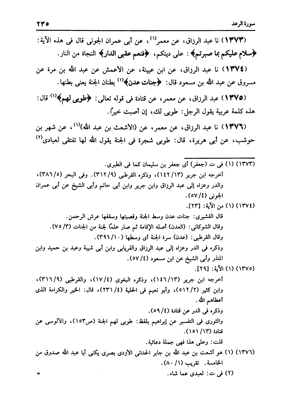 1375 - عَنْ مَعْمَرٍ , عَنْ قَتَادَةَ , فِي قَوْلِهِ تَعَالَى: {طُوبَى لَهُمْ} [الرعد: 29] , قَالَ: " §هَذِهِ كَلِمَةٌ عَرَبِيَّةٌ يَقُولُ الرَّجُلُ: طُوبَى لَكَ إِنْ أَصَبْتَ خَيْرًا "