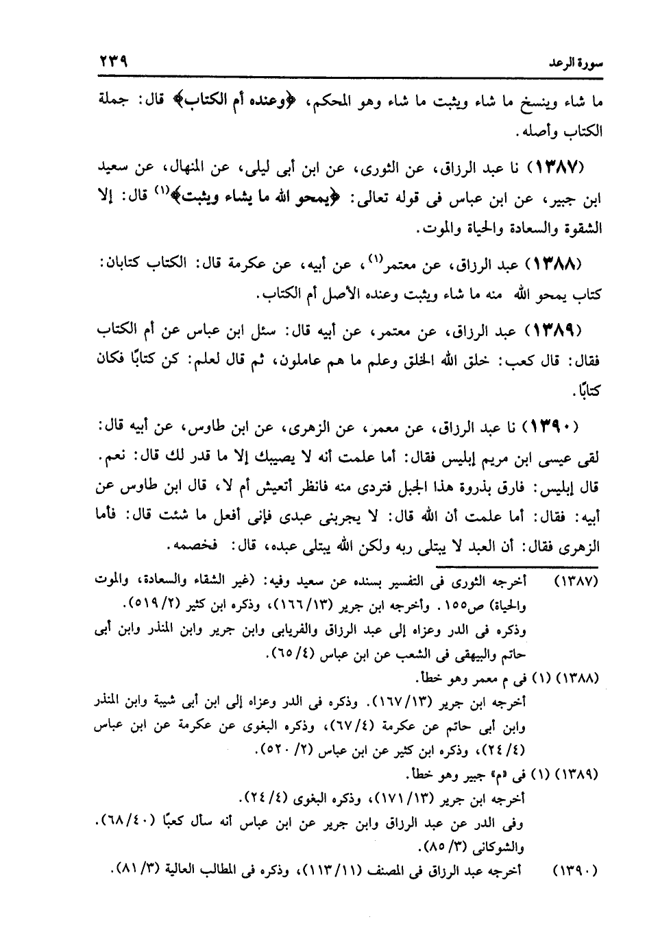1387 - عَنِ الثَّوْرِيِّ , عَنِ ابْنِ أَبِي لَيْلَى , عَنِ الْمِنْهَالِ , عَنْ سَعِيدِ بْنِ جُبَيْرٍ , عَنِ ابْنِ عَبَّاسٍ , فِي قَوْلِهِ تَعَالَى: {يَمْحُو اللَّهُ مَا يَشَاءُ وَيُثْبِتُ} [الرعد: 39] , قَالَ: «§إِلَّا الشَّقَوَةَ وَالسَّعَادَةَ وَالْحَيَاةَ وَالْمَوْتَ»