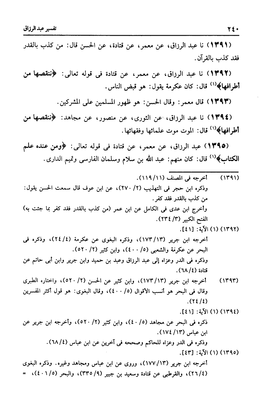 1392 - عَنْ مَعْمَرٍ , عَنْ قَتَادَةَ , فِي قَوْلِهِ تَعَالَى: {نَنْقُصُهَا مِنْ أَطْرَافِهَا} [الرعد: 41] , قَالَ: كَانَ عِكْرِمَةُ , يَقُولُ: «§هُوَ قَبْضُ النَّاسِ»