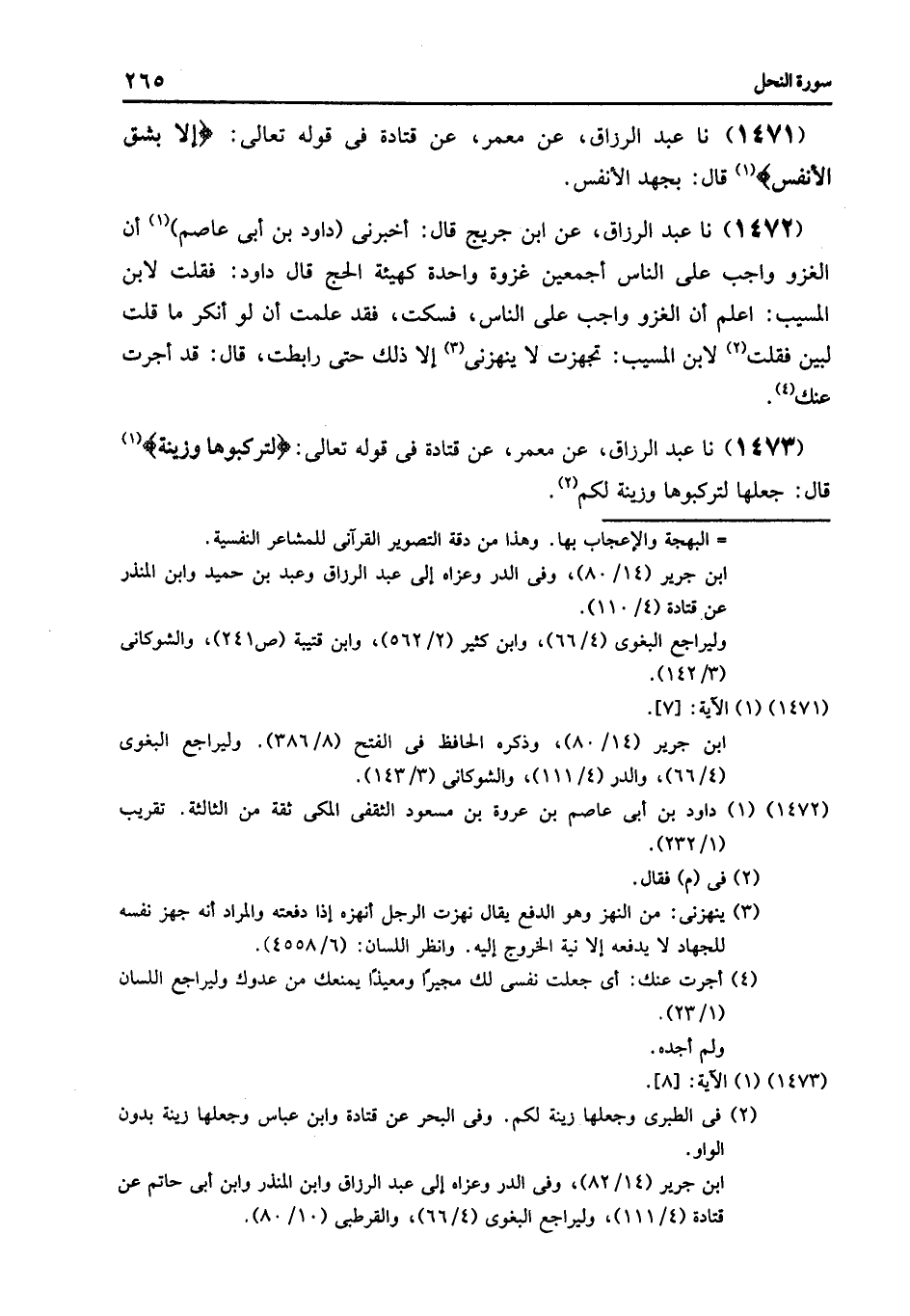 1473 - عَنْ مَعْمَرٍ , عَنْ قَتَادَةَ , فِي قَوْلِهِ تَعَالَى: {لِتَرْكَبُوهَا وَزِينَةً} [النحل: 8] , قَالَ: «§جَعَلَهَا لِتَرْكَبُوهَا وَزِينَةً لَكُمْ»