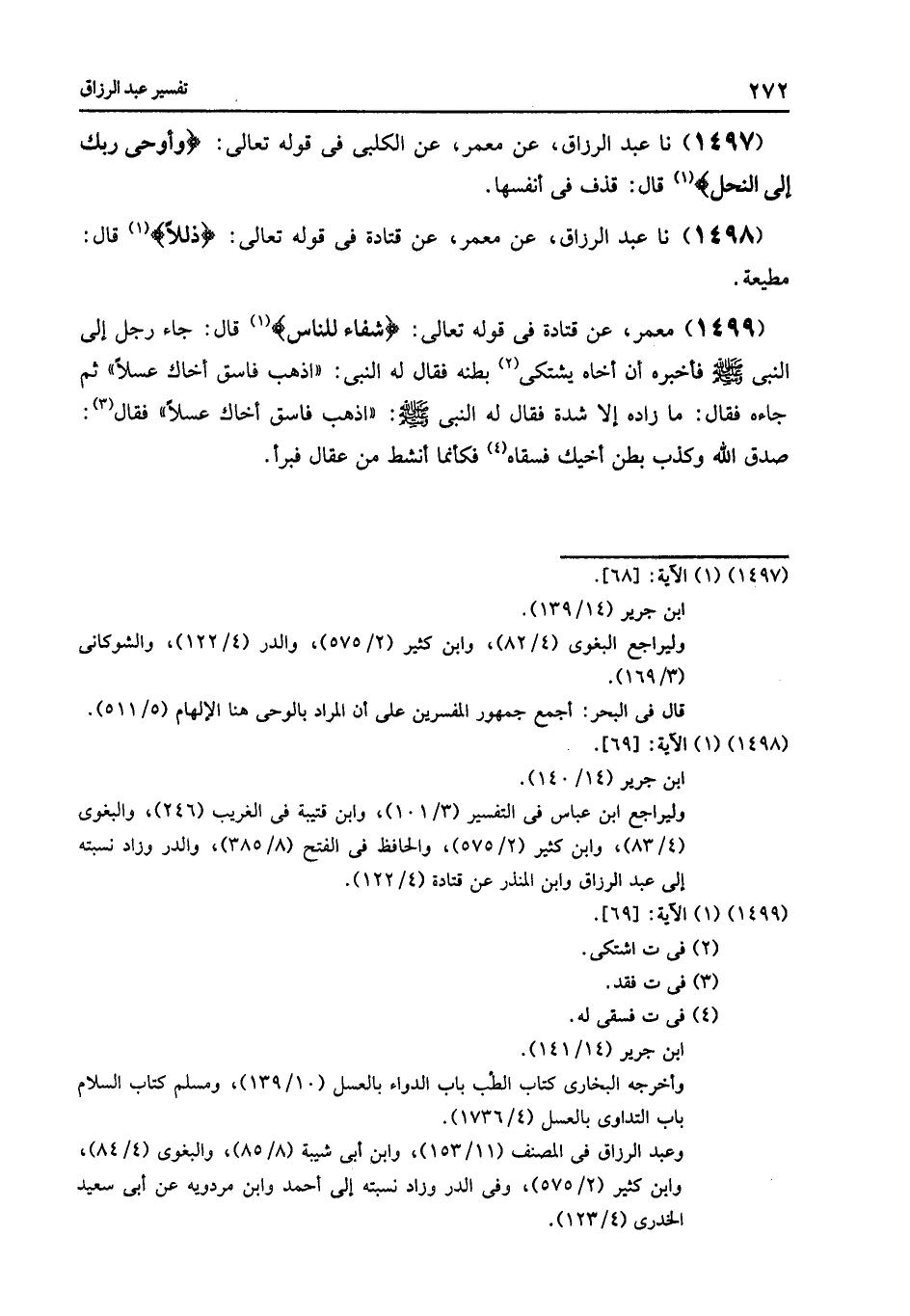1499 - مَعْمَرٌ , عَنْ قَتَادَةَ , فِي قَوْلِهِ تَعَالَى: {شِفَاءٌ لِلنَّاسِ} [النحل: 69] , قَالَ: جَاءَ رَجُلٌ إِلَى النَّبِيِّ صَلَّى اللهُ عَلَيْهِ وَسَلَّمَ , فَأَخْبَرَهُ أَنَّ أَخَاهَ يَشْتَكِي بَطْنَهُ , فَقَالَ لَهُ النَّبِيُّ: «§اذْهَبْ فَاسْقِ أَخَاكَ عَسَلًا» , ثُمَّ جَاءَهُ فَقَالَ: مَا زَادَهُ إِلَّا شِدَّةً , فَقَالَ لَهُ النَّبِيُّ صَلَّى اللهُ عَلَيْهِ وَسَلَّمَ: «اذْهَبْ فَاسْقِ أَخَاكَ عَسَلًا» فَقَالَ صَدَقَ اللَّهُ وَكَذَبَ بَطْنُ أَخِيكَ " فَسَقَاهُ فَكَأَنَّمَا أُنْشِطَ مِنْ عِقَالٍ فَبَرَأَ