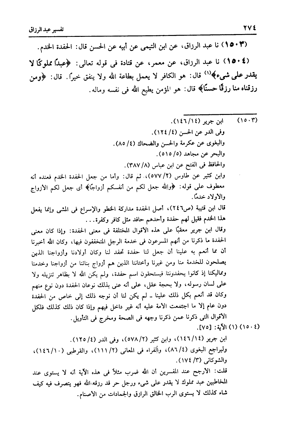 1504 - عَنْ مَعْمَرٍ , عَنْ قَتَادَةَ , فِي قَوْلِهِ تَعَالَى: {عَبْدًا مَمْلُوكًا لَا يَقْدِرُ عَلَى شَيْءٍ} [النحل: 75] , قَالَ: «§هُوَ الْكَافِرُ لَا يَعْمَلُ بِطَاعَةِ اللَّهِ وَلَا يُنْفِقُ خَيْرًا» , قَالَ: {وَمَنْ رَزَقْنَاهُ مِنَّا رِزْقًا حَسَنًا} [النحل: 75] , قَالَ: «هُوَ الْمُؤْمِنُ يُطِيعُ اللَّهَ فِي نَفْسِهِ وَمَالِهِ»