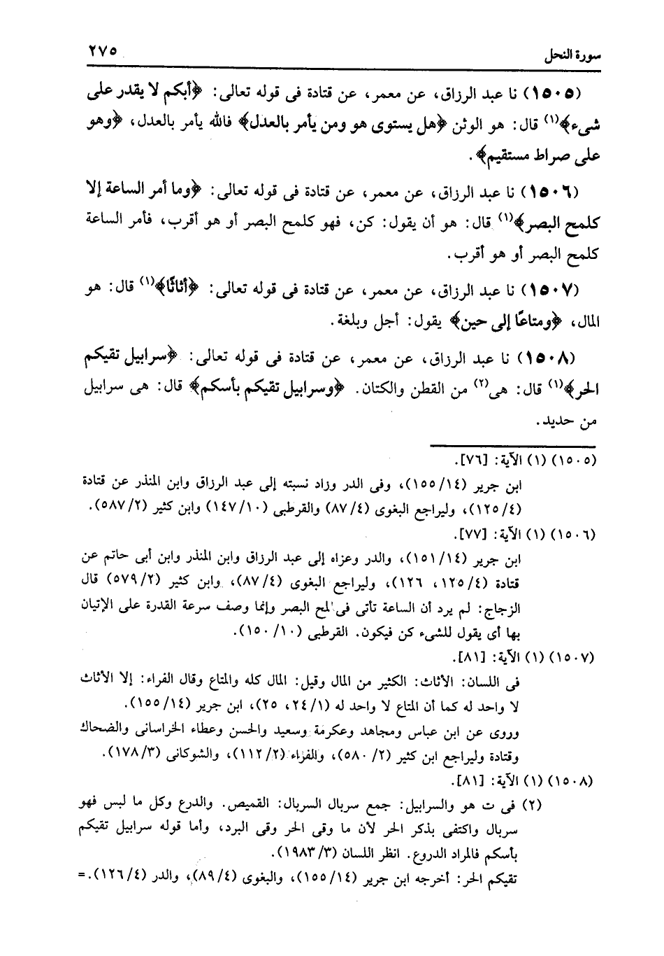 1508 - عَنْ مَعْمَرٍ , عَنْ قَتَادَةَ , فِي قَوْلِهِ تَعَالَى: {سَرَابِيلَ تَقِيكُمُ الْحَرَّ} [النحل: 81] , قَالَ: " §هِيَ مِنَ الْقُطْنِ وَالْكَتَّانِ {وَسَرَابِيلَ تَقِيكُمْ بَأْسَكُمْ} [النحل: 81] , قَالَ: «هِيَ سَرَابِيلُ مِنْ حَدِيدٍ»