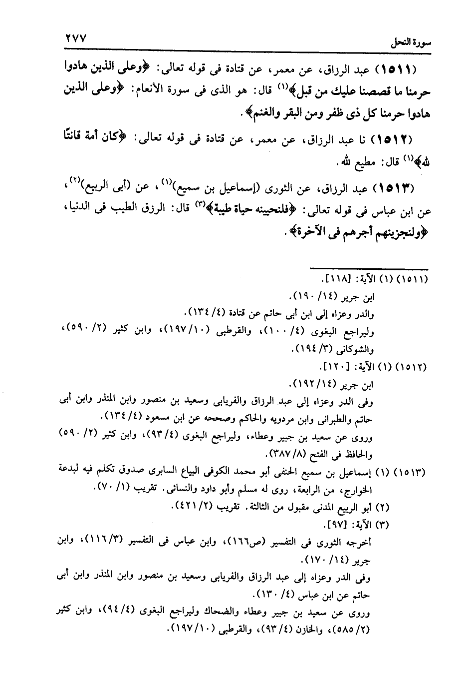 1511 - عَنْ مَعْمَرٍ , عَنْ قَتَادَةَ , فِي قَوْلِهِ تَعَالَى: {وَعَلَى الَّذِينَ هَادُوا حَرَّمْنَا مَا قَصَصْنَا عَلَيْكَ مِنْ قَبْلُ} [النحل: 118] , قَالَ: " §هُوَ الَّذِي فِي سُورَةِ الْأَنْعَامِ {وَعَلَى الَّذِينَ هَادُوا حَرَّمْنَا كُلَّ ذِي ظُفُرٍ وَمِنَ الْبَقَرِ وَالْغَنَمِ} [الأنعام: 146]