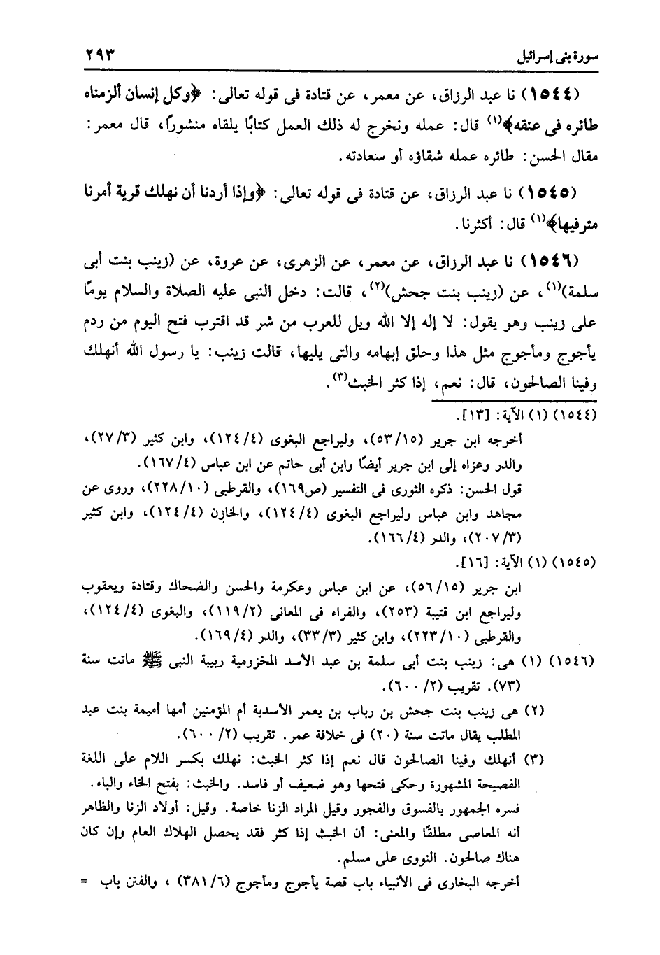 1544 - عَنْ مَعْمَرٍ , عَنْ قَتَادَةَ , فِي قَوْلِهِ تَعَالَى: {وَكُلَّ إِنْسَانٍ أَلْزَمْنَاهُ طَائِرَهُ فِي عُنُقِهِ} [الإسراء: 13] , قَالَ: «§عَمَلُهُ وَنُخْرِجُ لَهُ ذَلِكَ الْعَمَلَ كِتَابًا يَلْقَاهُ مَنْشُورًا» , قَالَ مَعْمَرٌ: وَقَالَ الْحَسَنُ: طَائِرُهُ عَمَلُهُ , شَقَاؤُهُ , أَوْ سَعَادَتُهُ