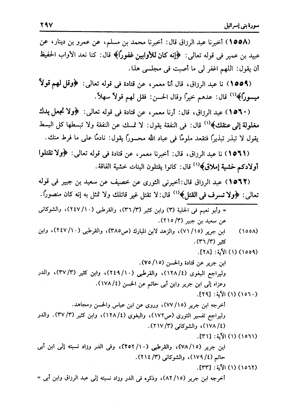 1560 - عَبْدُ الرَّزَّاقِ قَالَ: أرنا مَعْمَرٌ , عَنْ قَتَادَةَ فِي قَوْلِهِ تَعَالَى: {وَلَا تَجْعَلْ يَدَكَ مَغْلُولَةً إِلَى عُنُقِكَ} [الإسراء: 29] , قَالَ: " §فِي النَّفَقَةِ يَقُولُ: لَا تُمْسِكْ عَنِ النَّفَقَةِ {وَلَا تَبْسُطْهَا كُلَّ الْبَسْطِ} [الإسراء: 29] , يَقُولُ: «لَا تُبَذِّرْ تَبْذِيرًا فَتَقْعُدَ مَلُومًا فِي عِبَادِ اللَّهِ مَحْسُورًا» , يَقُولُ: «نَادِمًا عَلَى مَا فَرَطَ مِنْكَ»
