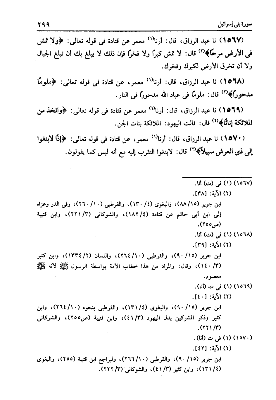 1569 - نا عَبْدُ الرَّزَّاقِ قَالَ: أرنا مَعْمَرٌ , عَنْ قَتَادَةَ , فِي قَوْلِهِ تَعَالَى: {وَاتَّخَذَ مِنَ الْمَلَائِكَةِ إِنَاثًا} [الإسراء: 40] , قَالَ: قَالَتِ الْيَهُودُ: «§الْمَلَائِكَةُ بَنَاتُ الْجِنِّ»