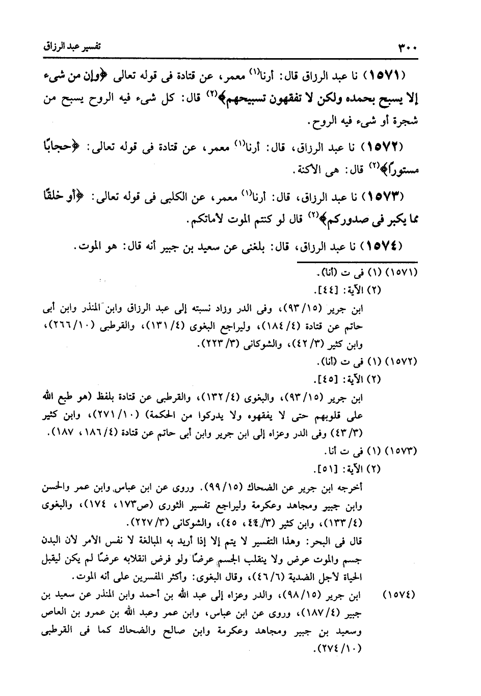 1571 - نا عَبْدُ الرَّزَّاقِ قَالَ: أرنا مَعْمَرٌ , عَنْ قَتَادَةَ , فِي قَوْلِهِ تَعَالَى: {وَإِنْ مِنْ شَيْءٍ إِلَّا يُسَبِّحُ بِحَمْدِهِ , وَلَكِنْ لَا تَفْقَهُونَ تَسْبِيحَهُمْ} [الإسراء: 44] , قَالَ: «§كُلُّ شَيْءٍ فِيهِ الرُّوحُ يُسَبِّحُ مِنْ شَجَرَةٍ أَوْ شَيْءٍ فِيهِ الرُّوحُ»