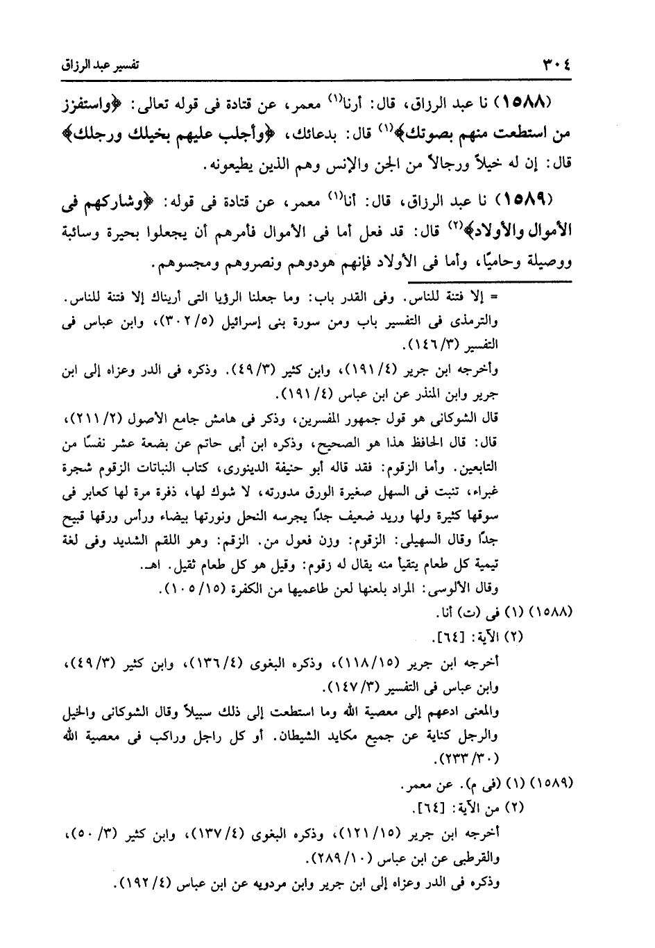 1590 - قَالَ عَبْدُ الرَّزَّاقِ قَالَ: مَعْمَرٌ , وَقَالَ الْحَسَنُ: {وَشَارِكْهُمْ فِي الْأَمْوَالِ} [الإسراء: 64] «§أَنْ يَكْسِبُوهَا مِنْ خَبِيثٍ , وَيُنْفِقُونَهَا فِي حَرَامٍ»