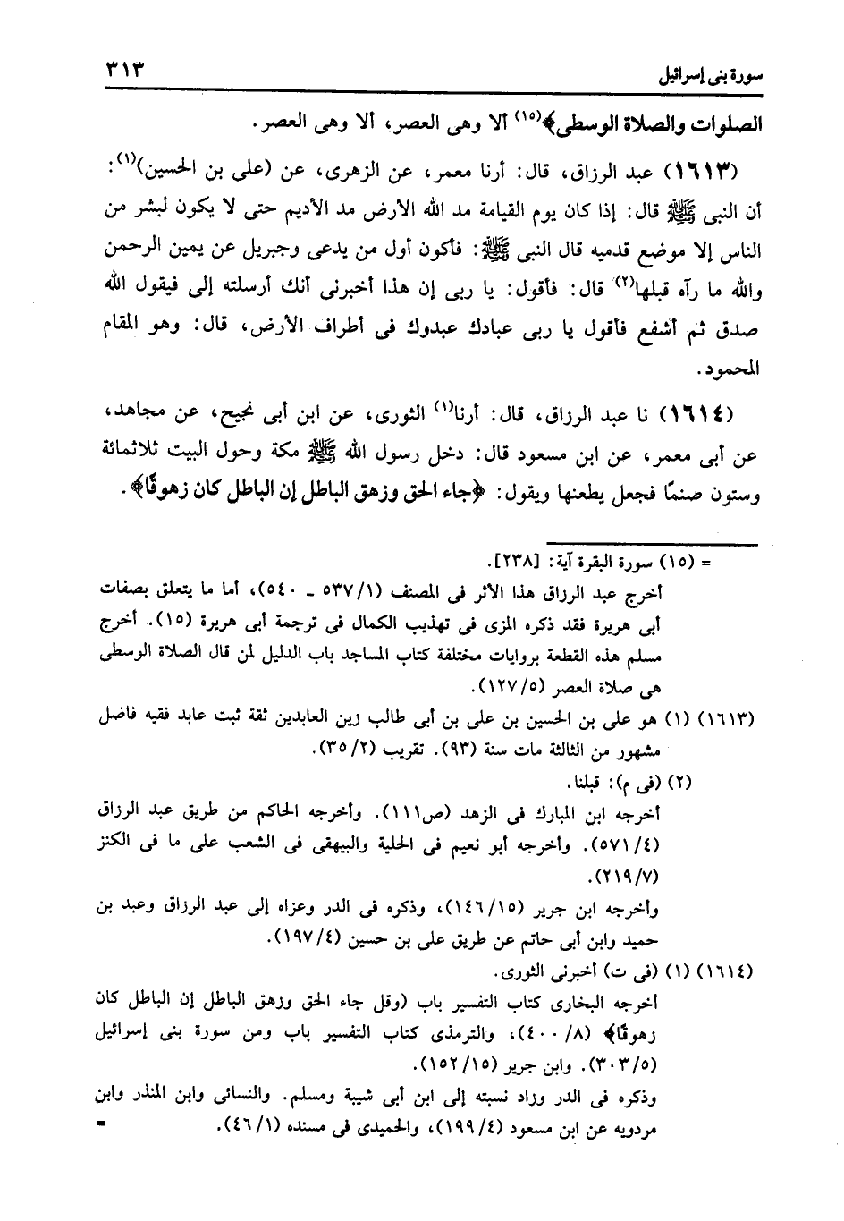 1612 - عَبْدُ الرَّزَّاقِ قَالَ: أرنا مَعْمَرٌ , عَنِ الزُّهْرِيِّ , عَنْ عَلِيِّ بْنِ الْحُسَيْنٍ أَنَّ النَّبِيَّ صَلَّى اللهُ عَلَيْهِ وَسَلَّمَ قَالَ: «إِذَا كَانَ يَوْمُ الْقِيَامَةِ مَدَّ اللَّهُ الْأَرْضَ مَدَّ الْأَدِيمِ حَتَّى لَا يَكُونَ لِبَشَرٍ مِنَ النَّاسِ إِلَّا مَوْضِعَ قَدَمَيْهِ» , قَالَ النَّبِيُّ صَلَّى اللهُ عَلَيْهِ وَسَلَّمَ: " §فَأَكُونُ أَوَّلَ مَنْ يُدْعَى وَجِبْرِيلُ عَنْ يَمِينِ الرَّحْمَنِ وَاللَّهِ مَا رَآهُ قَبْلَهَا , قَالَ: فَأَقُولُ: يَا رَبِّ إِنَّ هَذَا أَخْبَرَنِي أَنَّكُ أَرْسَلْتَهُ إِلَيَّ فَيَقُولُ اللَّهُ: صَدَقَ ثُمَّ أَشْفَعَ , فَأَقُولُ: يَا رَبِّ عِبَادُكَ عَبَدُوكَ فِي أَطْرَافِ الْأَرْضِ , قَالَ: وَهُوَ الْمَقَامُ الْمَحْمُودُ "
