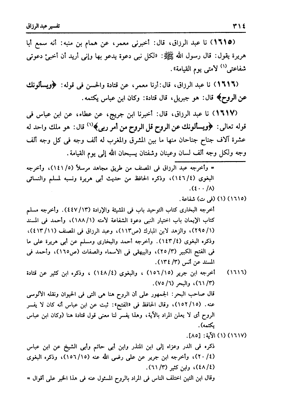 1617 - نا عَبْدُ الرَّزَّاقِ قَالَ: أَخْبَرَنَا ابْنُ جُرَيْجٍ , عَنْ عَطَاءٍ , عَنِ ابْنِ عَبَّاسٍ , فِي قَوْلِهِ تَعَالَى: {وَيَسْأَلُونَكَ عَنِ الرُّوحِ , قُلِ الرُّوحَ مِنْ أَمْرِ رَبِّي} [الإسراء: 85] , قَالَ: «§هُوَ مَلَكٌ وَاحِدٌ لَهُ عَشَرَةُ آلَافِ جِنَاحٍ جَنَاحَانِ مِنْهَا مَا بَيْنَ الْمَشْرِقِ وَالْمَغْرِبِ , لَهُ أَلْفُ وَجْهٍ فِي كُلِّ وَجْهٍ أَلْفُ وَجْهٍ , وَلِكُلِّ وَجْهٍ أَلْفُ لِسَانٍ وَعَيْنَانِ وَشَفَتَانِ تُسَبِّحَانِ اللَّهَ إِلَى يَوْمِ الْقِيَامَةِ»