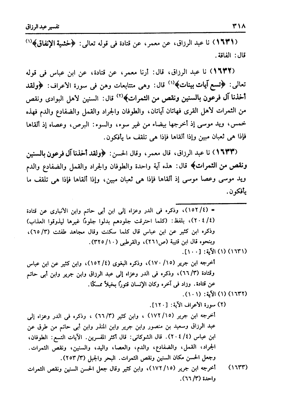 1632 - نا عَبْدُ الرَّزَّاقِ قَالَ: أرنا مَعْمَرٌ , عَنْ قَتَادَةَ , عَنِ ابْنِ عَبَّاسٍ , فِي قَوْلِهِ تَعَالَى: {تِسْعَ آيَاتٍ بَيِّنَاتٍ} [الإسراء: 101] , قَالَ: " §وَهِيَ مُتَتَابِعَاتٌ , وهُنَّ فِي سُورَةِ الْأَعْرَافِ {وَلَقَدْ أَخَذْنَا آلَ فِرْعَوْنَ بِالسِّنِينَ وَنَقْصٍ مِنَ الثَّمَرَاتِ} [الأعراف: 130] , قَالَ: «السِّنِينَ لِأَهْلِ الْبَوَادِي , وَنَقْصٌ مِنَ الثَّمَرَاتِ لِأَهْلِ الْقُرَى فَهَاتَانِ آيَتَانِ , وَالطُّوفَانُ , وَالْجَرَادُ , وَالْقُمَّلُ , وَالضَّفَادِعُ وَالدَّمُ فَهَذِهِ خَمْسٌ , وَيَدُ مُوسَى إِذْ أَخْرَجَهَا بَيْضَاءَ مِنْ غَيْرِ سُوءٍ وَالسَّوْءُ الْبَرَصُ , وَعَصَاهُ إِذْ أَلْقَاهَا فَإِذَا هِيَ ثُعْبَانٌ مُبِينٌ وَإِذَا أَلْقَاهَا فَإِذَا هِيَ تَلْقَفُ مَا يَأْفِكُونَ»