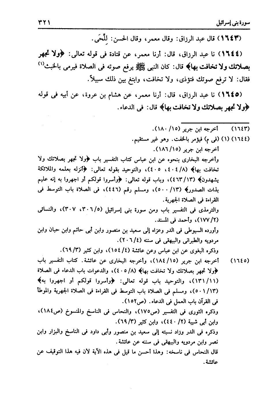 1645 - نا عَبْدُ الرَّزَّاقِ قَالَ: أرنا مَعْمَرٌ , عَنْ هِشَامِ بْنِ عُرْوَةَ , عَنْ أَبِيهِ , فِي قَوْلِهِ: {§وَلَا تَجْهَرْ بِصَلَاتِكَ وَلَا تُخَافِتْ بِهَا} [الإسراء: 110] , قَالَ: «فِي الدُّعَاءِ»