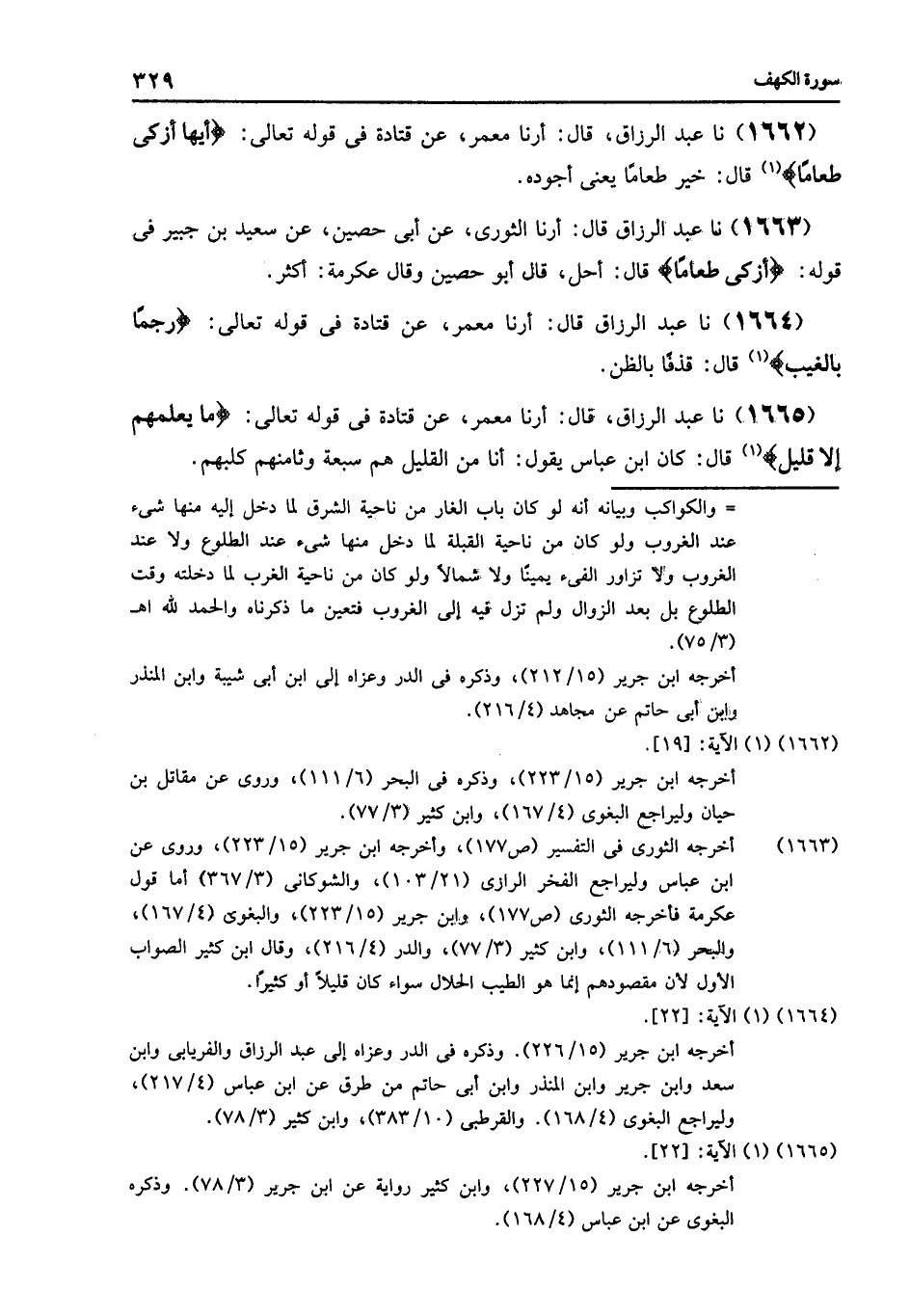 1665 - نا عَبْدُ الرَّزَّاقِ قَالَ: أرنا مَعْمَرٌ , عَنْ قَتَادَةَ , فِي قَوْلِهِ تَعَالَى: {مَا يَعْلَمُهُمْ إِلَّا قَلِيلٌ} [الكهف: 22] , قَالَ: كَانَ ابْنُ عَبَّاسٍ , يَقُولُ: «§أَنَا مِنَ الْقَلِيلِ هُمْ سَبْعَةٌ وَثَامِنُهُمْ كَلْبُهُمْ»