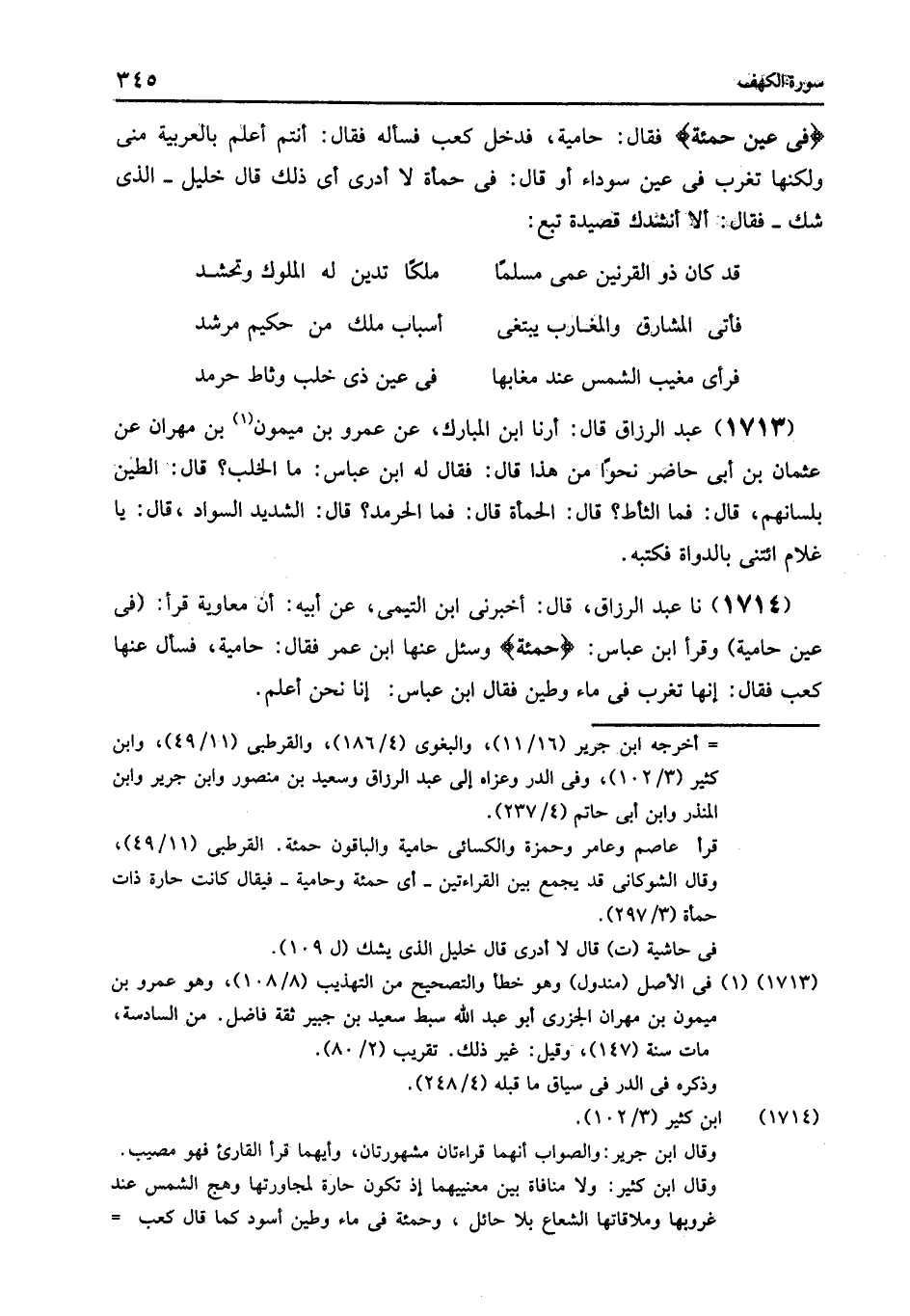 1714 - أَخْبَرَنِي ابْنُ التَّيْمِيِّ , عَنْ أَبِيهِ أَنَّ مُعَاوِيَةَ قَرَأَ: (§فِي عَيْنٍ حَامِيَةٍ) , وَقَرَأَ ابْنُ عَبَّاسٍ حَمِئَةٍ وَسُئِلَ عَنْهَا ابْنُ عُمَرَ فَقَالَ: (حَامِيَةٍ) فَسَأَلَ عَنْهَا كَعْبًا , فَقَالَ: «إِنَّهَا تَغْرُبُ فِي مَاءٍ وَطِينٍ» , فَقَالَ ابْنُ عَبَّاسٍ: «إِنَّا نَحْنُ أَعْلَمُ»