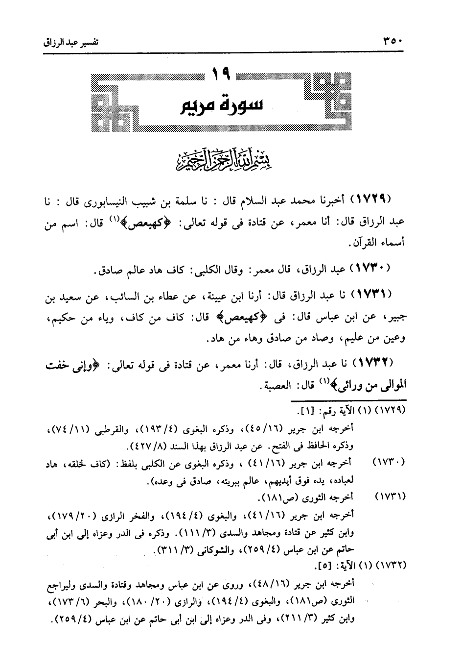 1732 - نا عَبْدُ الرَّزَّاقِ قَالَ: أرنا مَعْمَرٌ , عَنْ قَتَادَةَ فِي قَوْلِهِ تَعَالَى: {§وَإِنِّي خِفْتُ الْمَوَالِيَ مِنْ وَرَائِي} [مريم: 5] , قَالَ: «الْعُصْبَةَ»