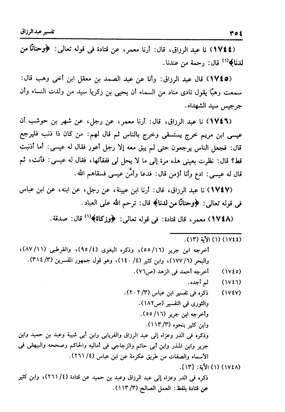 1747 - نا عَبْدُ الرَّزَّاقِ قَالَ: أرنا ابْنُ عُيَيْنَةَ , عَنْ رَجُلٍ , عَنْ ابْنِهِ , عَنِ ابْنِ عَبَّاسٍ فِي قَوْلِهِ تَعَالَى: {§وَحَنَانًا مِنْ لَدُنَّا} [مريم: 13] , قَالَ: «تَرَحَّمَ اللَّهُ عَلَى الْعِبَادِ»