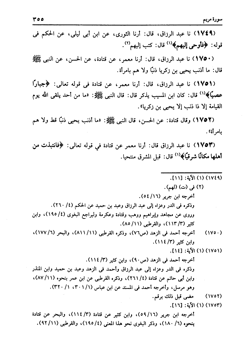 1751 - نا عَبْدُ الرَّزَّاقِ قَالَ: أرنا مَعْمَرٌ , عَنْ قَتَادَةَ فِي قَوْلِهِ تَعَالَى: {جَبَّارًا عَصِيًّا} [مريم: 14] , قَالَ: كَانَ ابْنُ الْمُسَيِّبِ يَذْكُرُ قَالَ: قَالَ النَّبِيُّ صَلَّى اللهُ عَلَيْهِ وَسَلَّمَ: «§مَا مِنْ أَحَدٍ يَلْقَى اللَّهَ يَوْمَ الْقِيَامَةِ إِلَّا ذَا ذَنْبٍ إِلَّا يَحْيَى بْنَ زَكَرِيَّا»