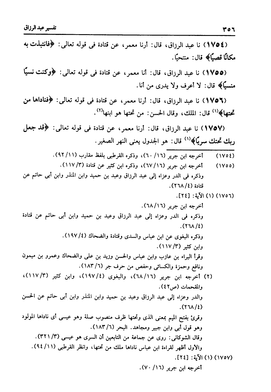 1757 - نا عَبْدُ الرَّزَّاقِ قَالَ: أرنا مَعْمَرٌ , عَنْ قَتَادَةَ فِي قَوْلِهِ تَعَالَى: {قَدْ جَعَلَ رَبُّكِ تَحْتَكِ سَرِيًّا} [مريم: 24] , قَالَ: «§هُوَ الْجَدْوَلُ» يَعْنِي النَّهْرَ الصَّغِيرَ