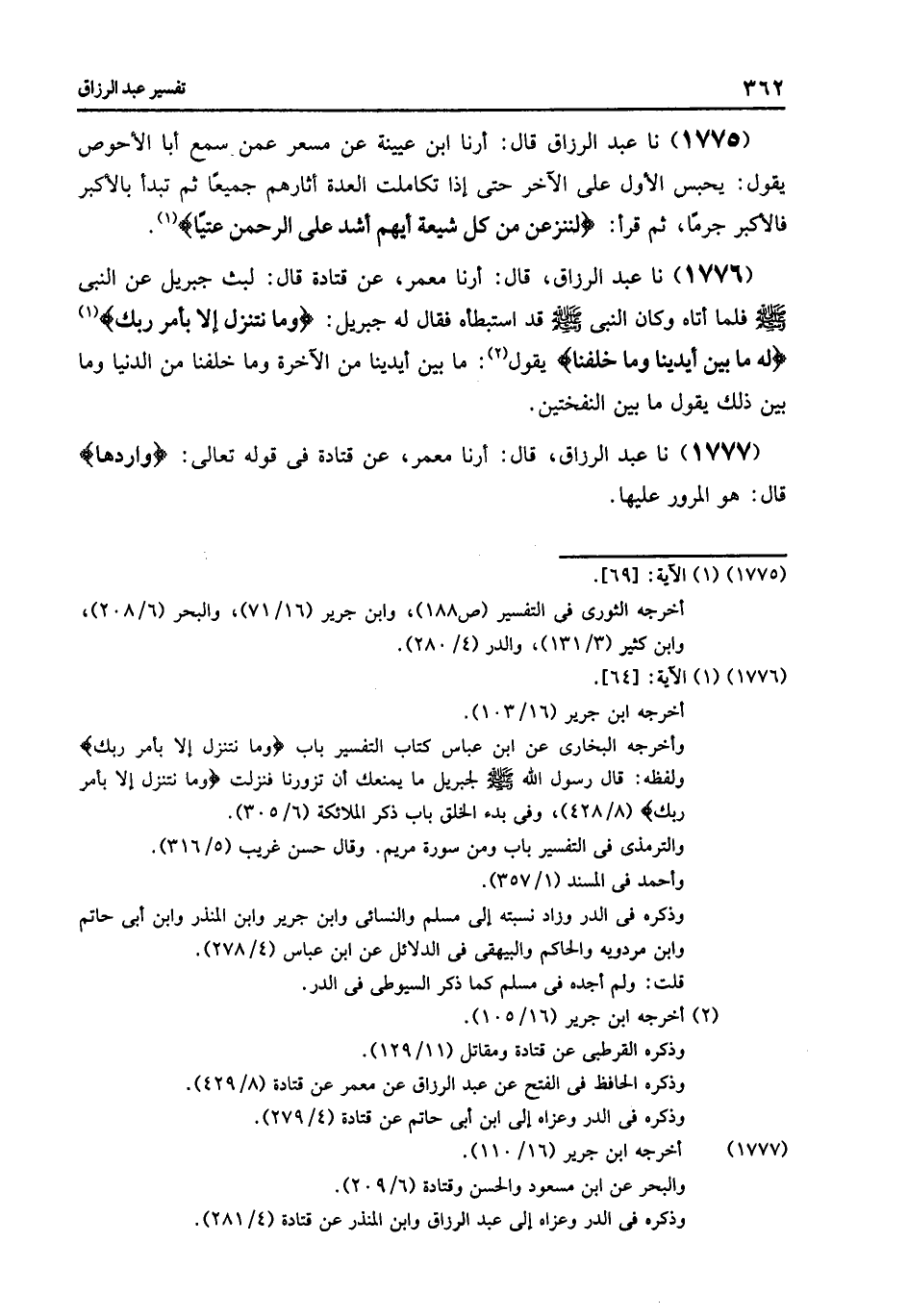 1786 - نا عَبْدُ الرَّزَّاقِ قَالَ: أرنا مَعْمَرٌ , عَنْ قَتَادَةَ فِي قَوْلِهِ تَعَالَى: {§وَنَرِثُهُ مَا يَقُولُ} [مريم: 80] , قَالَ: " مَا عِنْدَهُ وَهُوَ قَوْلُهُ: {لَأُوتَيَنَّ مَالًا وَوَلَدًا} [مريم: 77] , وَفِي حَرْفِ ابْنِ مَسْعُودٍ (وَنَرِثُهُ مَا عِنْدَهُ) "
