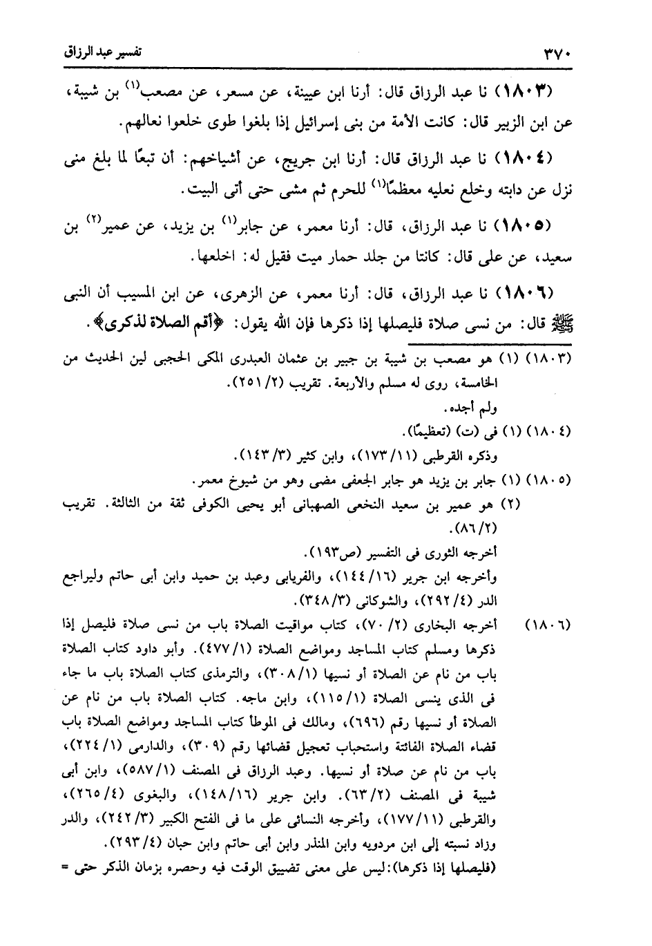 1806 - نا عَبْدُ الرَّزَّاقِ قَالَ: أرنا مَعْمَرٌ , عَنِ الزُّهْرِيِّ , عَنِ ابْنِ الْمُسَيِّبِ أَنَّ النَّبِيَّ صَلَّى اللهُ عَلَيْهِ وَسَلَّمَ قَالَ: «§مَنْ نَسِيَ صَلَاةً , فَلْيُصَلِّهَا إِذَا ذَكَرَهَا» فَإِنَّ اللَّهَ يَقُولُ: {أَقِمِ الصَّلَاةَ لِذِكْرِي} [طه: 14]