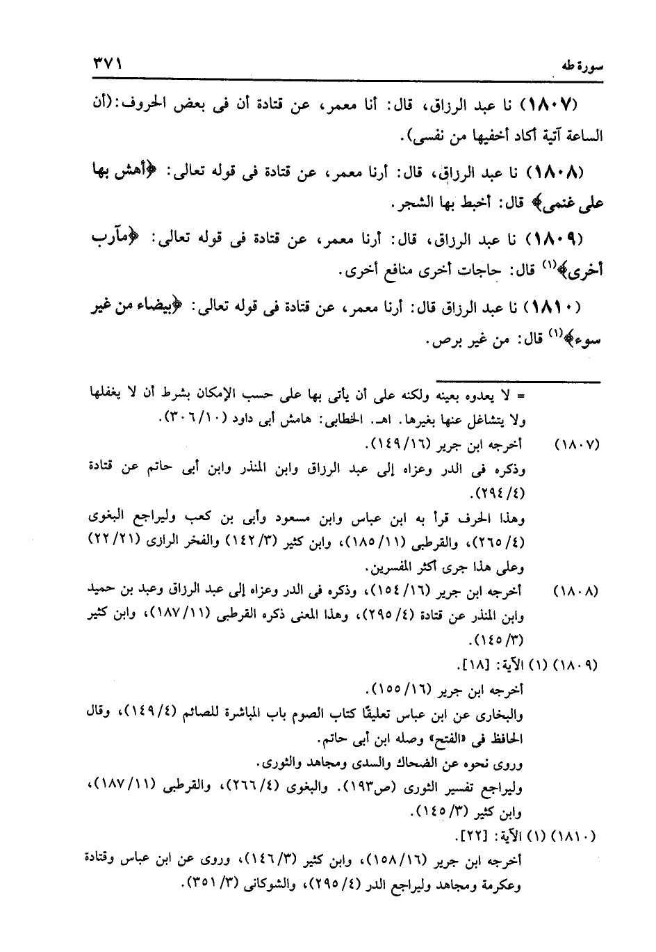 1810 - نا عَبْدُ الرَّزَّاقِ قَالَ: أرنا مَعْمَرٌ , عَنْ قَتَادَةَ فِي قَوْلِهِ تَعَالَى: {§بَيْضَاءَ مِنْ غَيْرِ سُوءٍ} [طه: 22] , قَالَ: «مِنْ غَيْرِ بَرَصٍ»