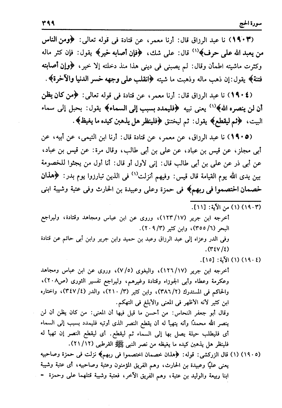 1906 - نا عَبْدُ الرَّزَّاقِ قَالَ: أرنا مَعْمَرٌ , عَنْ قَتَادَةَ فِي قَوْلِهِ تَعَالَى: {يُصْهَرُ بِهِ مَا فِي بُطُونِهِمْ وَالْجُلُودُ} [الحج: 20] , قَالَ: «§يُذَابُ مَا فِي بُطُونِهِمْ»
