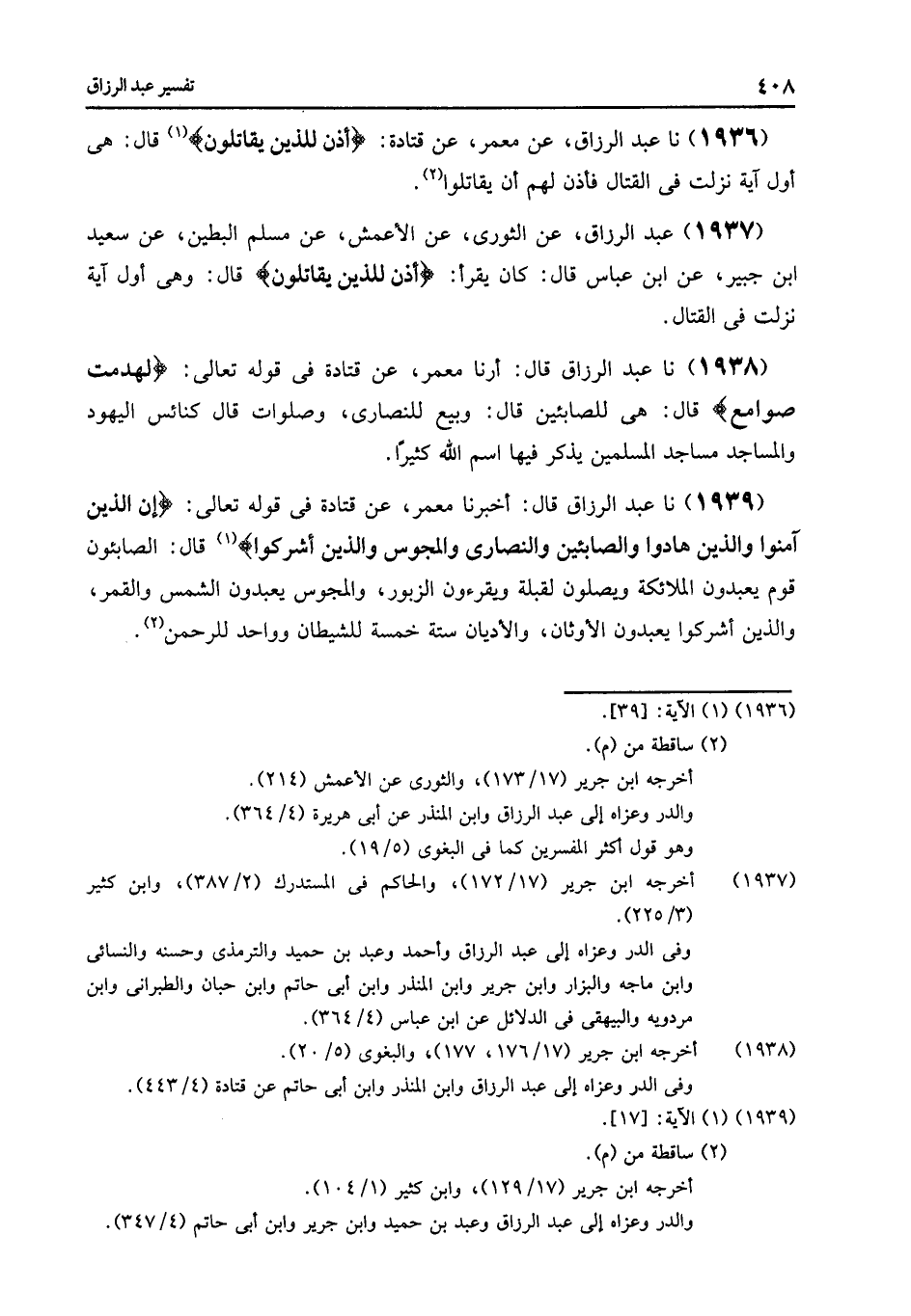 1938 - نا عَبْدُ الرَّزَّاقِ قَالَ: أرنا مَعْمَرٌ , عَنْ قَتَادَةَ فِي قَوْلِهِ تَعَالَى: {لَهُدِّمَتْ صَوَامِعُ} [الحج: 40] , قَالَ: «§هِيَ لِلصَّابِئِينَ» , قَالَ: " وَبِيَعٌ لِلنَّصَارَى {وَصَلَوَاتٌ} [التوبة: 99] , قَالَ: «كَنَائِسُ الْيَهُودِ وَالْمَسَاجِدُ مَسَاجِدُ الْمُسْلِمِينَ يُذْكُرُ فِيهَا اسْمُ اللَّهِ كَثِيرًا»
