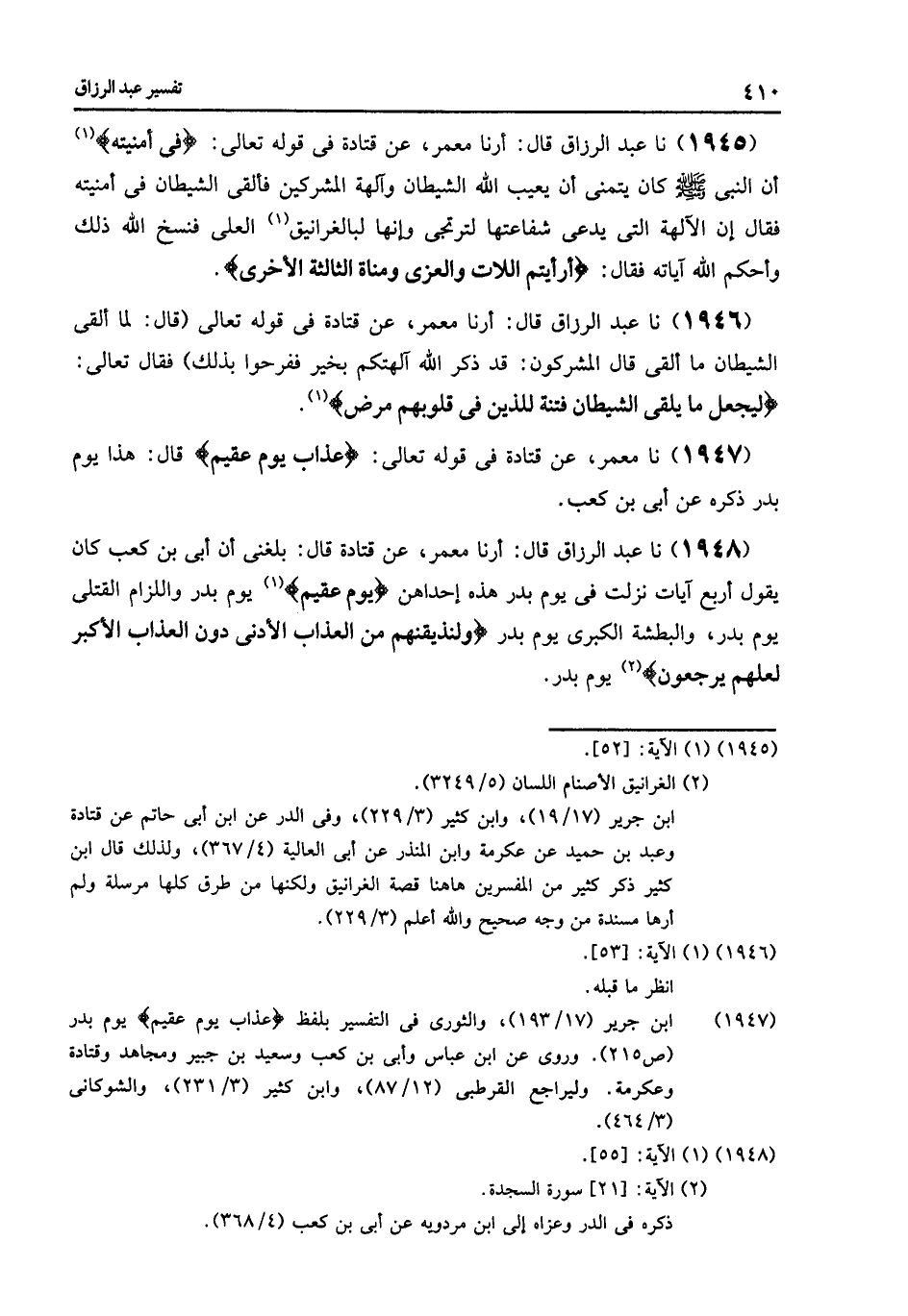 1946 - نا عَبْدُ الرَّزَّاقِ قَالَ: أرنا مَعْمَرٌ , عَنْ قَتَادَةَ فِي قَوْلِهِ تَعَالَى , قَالَ: " §لَمَّا أَلْقَى الشَّيْطَانُ مَا أَلْقَى قَالَ الْمُشْرِكُونَ: قَدْ ذَكَرَ اللَّهُ آلِهَتَكُمْ بِخَيْرٍ فَفَرِحُوا بِذَلِكَ " , فَقَالَ تَعَالَى: {لِيَجْعَلَ مَا يُلْقِي الشَّيْطَانُ فِتْنَةً لِلَّذِينَ فِي قُلُوبِهِمْ مَرَضٌ} [الحج: 53]