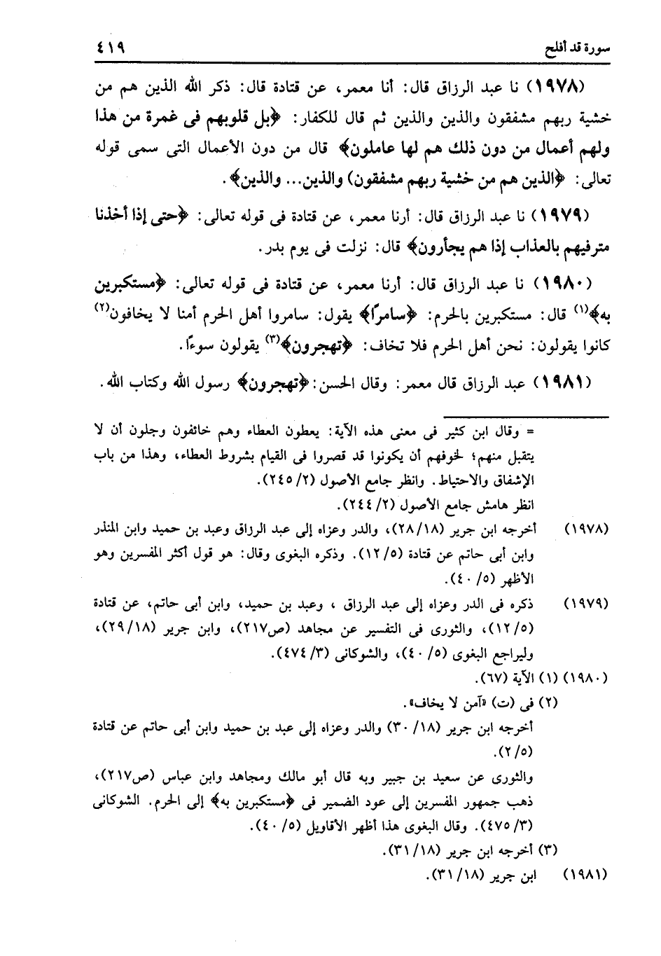 1980 - نا عَبْدُ الرَّزَّاقِ قَالَ: أرنا مَعْمَرٌ , عَنْ قَتَادَةَ فِي قَوْلِهِ تَعَالَى: {مُسْتَكْبِرِينَ بِهِ} [المؤمنون: 67] , قَالَ: " §مُسْتَكْبِرِينَ بِالْحَرَمِ {سَامِرًا} [المؤمنون: 67] يَقُولُ: " سَامَرُوا أَهْلَ الْحَرَمِ أَمْنًا لَا يَخَافُونَ , كَانُوا يَقُولُونَ: نَحْنُ أَهْلُ الْحَرَمِ فَلَا تَخَافُ {تَهْجُرُونُ} [المؤمنون: 67] يَقُولُونَ سُوءًا "