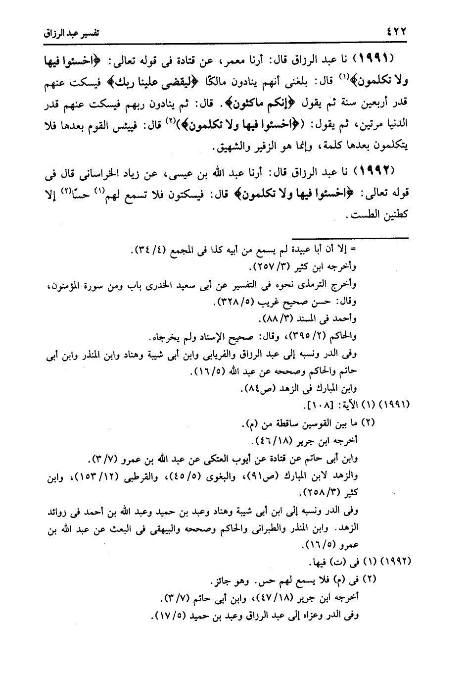 1994 - نا عَبْدُ الرَّزَّاقِ قَالَ: أرنا مَعْمَرٌ , عَنْ قَتَادَةَ فِي قَوْلِهِ تَعَالَى: {§فَاسْأَلِ الْعَادِّينَ} [المؤمنون: 113] , قَالَ: «الْحُسَّابَ»