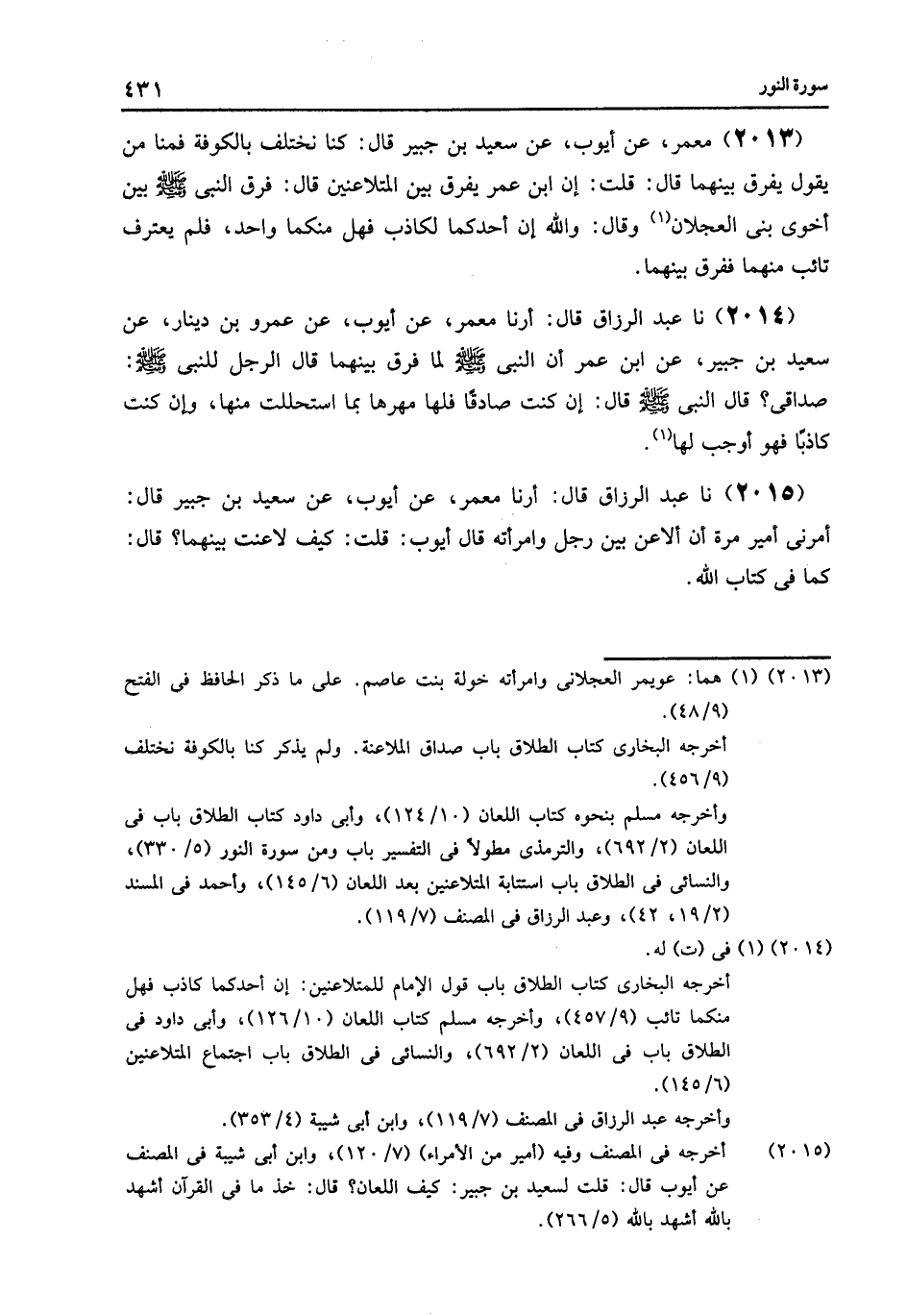 2015 - نا عَبْدُ الرَّزَّاقِ قَالَ: أرنا مَعْمَرٌ , عَنْ أَيُّوبَ , عَنْ سَعِيدِ بْنِ جُبَيْرٍ , قَالَ: «§أَمَرَنِي أَمِيرٌ مَرَّةً أَنْ أُلَاعِنَ بَيْنَ رَجُلٍ وَامْرَأَتِهِ» قَالَ أَيُّوبُ: فَقُلْتُ لَهُ: كَيْفَ لَاعَنْتَ بَيْنَهُمَا؟ قَالَ: «كَمَا فِي كِتَابِ اللَّهِ»