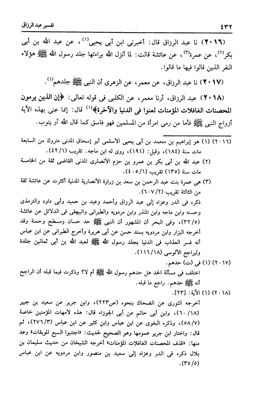 2018 - عَبْدُ الرَّزَّاقِ أرنا مَعْمَرٌ , عَنِ الْكَلْبِيِّ فِي قَوْلِهِ تَعَالَى: {إِنَّ الَّذِينَ يَرْمُونَ الْمُحْصَنَاتِ الْغَافِلَاتِ الْمُؤْمِنَاتِ لُعِنُوا فِي الدُّنْيَا وَالْآخِرَةِ} [النور: 23] , قَالَ: «§إِنَّمَا عَنَى بِهَذِهِ الْآيَةِ أَزْوَاجَ النَّبِيِّ صَلَّى اللهُ عَلَيْهِ وَسَلَّمَ , فَأَمَّا مَنْ رَمَى امْرَأَةً مِنَ الْمُسْلِمِينَ , فَهُوَ فَاسِقٌ كَمَا قَالَ اللَّهُ أَوْ يَتُوبُ»