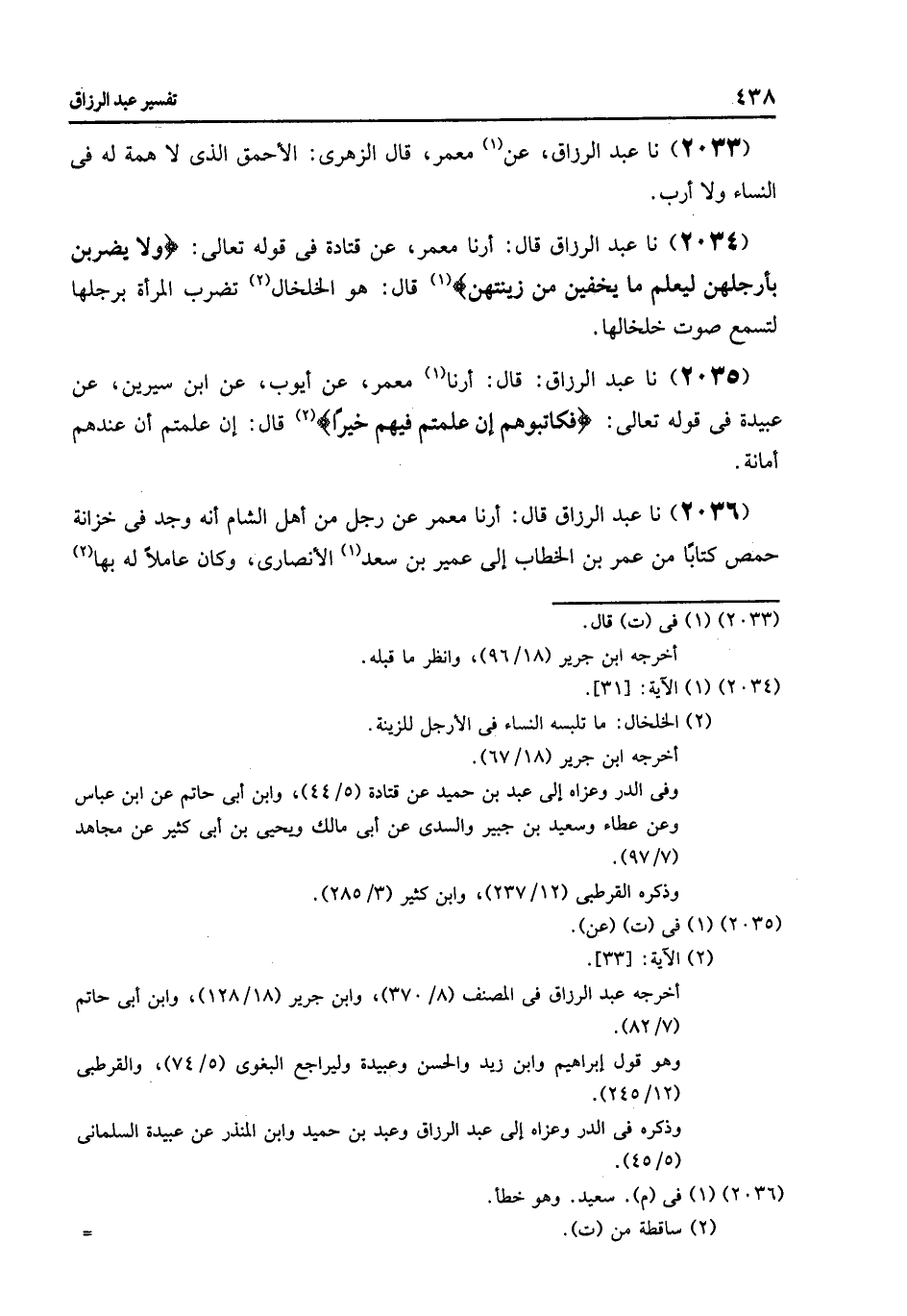 2034 - نا عَبْدُ الرَّزَّاقِ قَالَ: أرنا مَعْمَرٌ , عَنْ قَتَادَةَ فِي قَوْلِهِ تَعَالَى: {وَلَا يَضْرِبْنَ بِأَرْجُلِهِنَّ لِيُعْلَمَ مَا يُخْفِينَ مِنْ زِينَتِهِنَّ} [النور: 31] , قَالَ: «§هُوَ الْخَلْخَالُ تَضْرِبُ الْمَرْأَةُ بِرِجْلِهَا لِيُسْمَعَ صَوْتُ خَلْخَالِهَا»