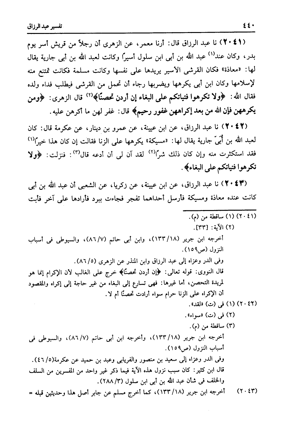 2043 - نا عَبْدُ الرَّزَّاقِ عَنِ ابْنِ عُيَيْنَةَ , عَنْ زَكَرِيَّا , عَنِ الشَّعْبِيِّ أَنَّ §عَبْدَ اللَّهِ بْنَ أُبَيٍّ كَانَتْ عِنْدَهُ مُعَاذَةُ وَمُسَيْكَةُ فَأَرْسَلَ إِحْدَاهُمَا تَفْجُرُ فَجَاءَتْ بِبُرْدٍ فَأَرَادَهَا عَلَى آخَرَ فَأَبَتْ فَنَزَلَتْ لَهُمَا التَّوْبَةُ دُونَهُ "