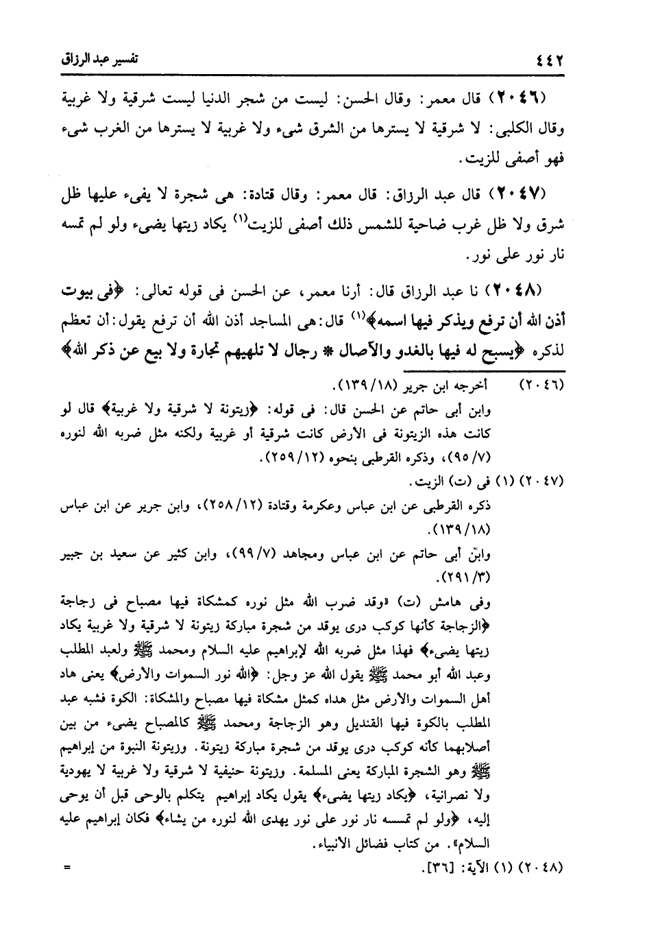 2051 - نا عَبْدُ الرَّزَّاقِ قَالَ: أرنا مَعْمَرٌ , عَنِ الْحَسَنِ فِي قَوْلِهِ تَعَالَى: {§فِي بُيُوتٍ أَذِنَ اللَّهُ أَنْ تُرْفَعَ وَيُذْكَرَ فِيهَا اسْمُهُ} [النور: 36] , قَالَ: " هِيَ الْمَسَاجِدُ أَذِنَ اللَّهُ أَنْ تُرْفَعَ , يَقُولُ: أَنْ تُعَظَّمَ لِذِكْرِهِ {يُسَبِّحُ لَهُ فِيهَا بِالْغُدُوِّ وَالْآصَالِ رِجَالٌ لَا تُلْهِيهِمْ تِجَارَةٌ وَلَا بَيْعٌ عَنْ ذِكْرِ اللَّهِ} [النور: 37] أَذِنَ اللَّهُ أَنْ تُبْنَى , وَيُصَلَّى لَهُ فِيهَا بِالْغُدُوِّ وَالْآصَالِ "